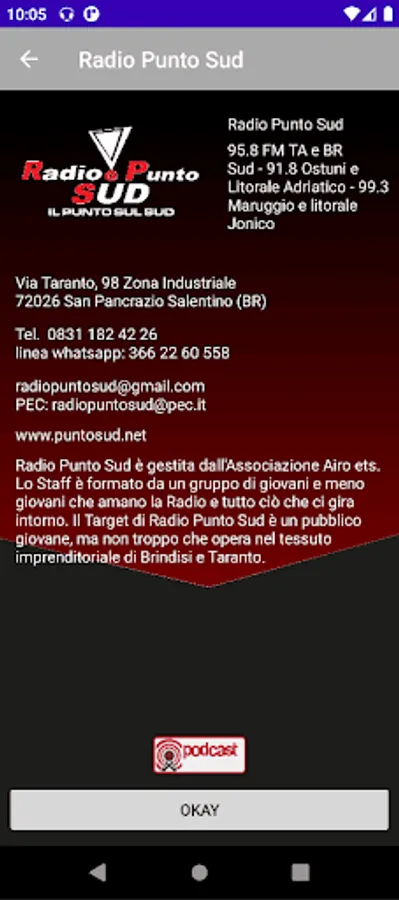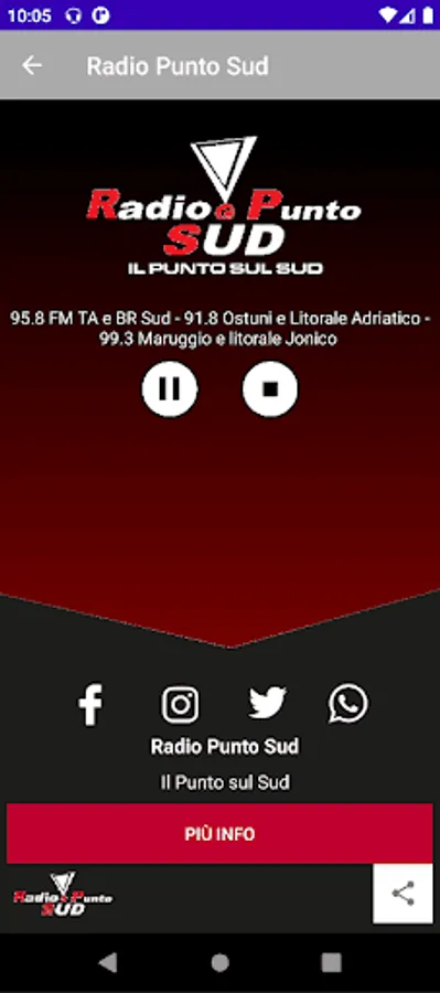 Through this application it is possible to listen to Radio Punto Sud anywhere in the world thanks to the power of the internet and streaming technology. Within the app there are also links to social networks Facebook, Twitter, and Instagram on which Radio punto sud is present and also the link to Whatsapp to send us text and voice messages and to get in touch with the Speaker and DJ staff