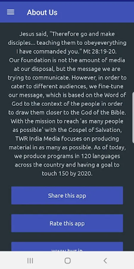 Your busy schedule coming between you and God? is Spending some quiet time becoming more impossible by the day? Download the TWR India App today and spend time meditating on the word of God with our systematic verse by verse audio bible study programs on the go! With programs in multiple languages and new programs added every week, you will always find something for you