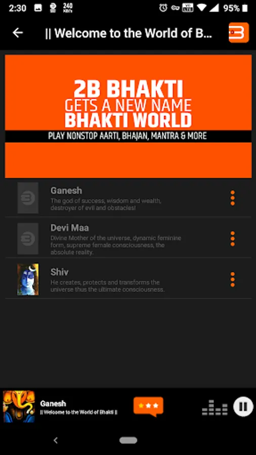 Bhakti World is your one stop App with 9 different channels of Gods and Goddesses that includes Ganesha, Devi Maa, Shri Krishna, Shiva, Shri Ram, Hanuman, Sai Baba, Gurbani and Dhyan.