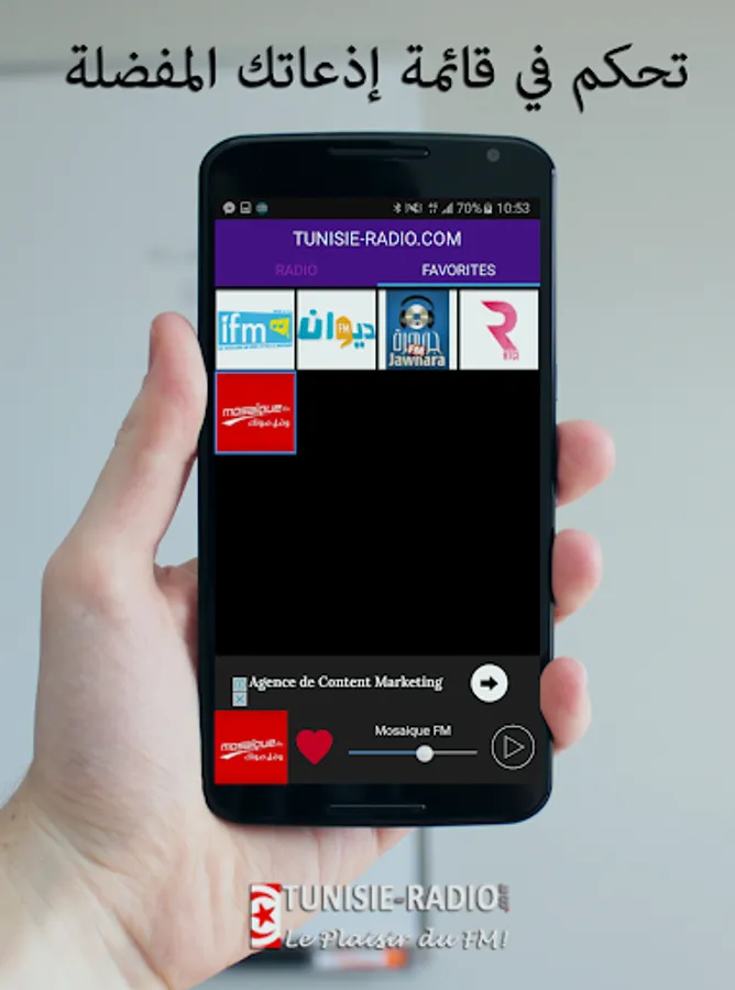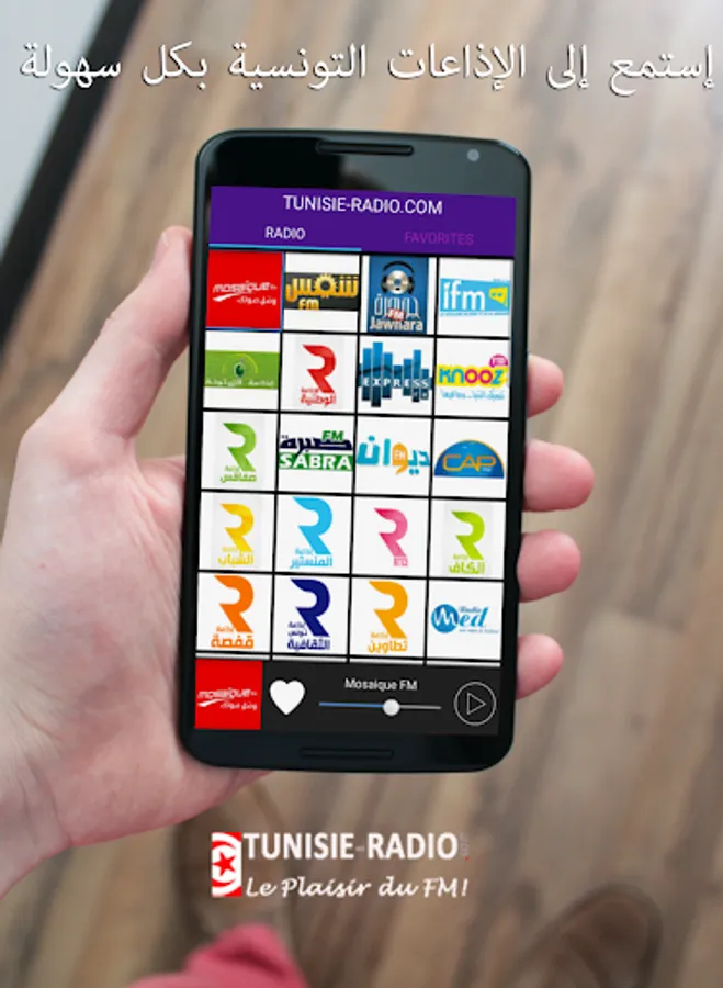 One click on the logo of the radio, you listen live streaming. You also control the volume and you manage the list of your favorite Tunisia Radios.
