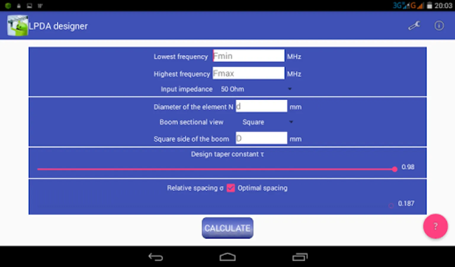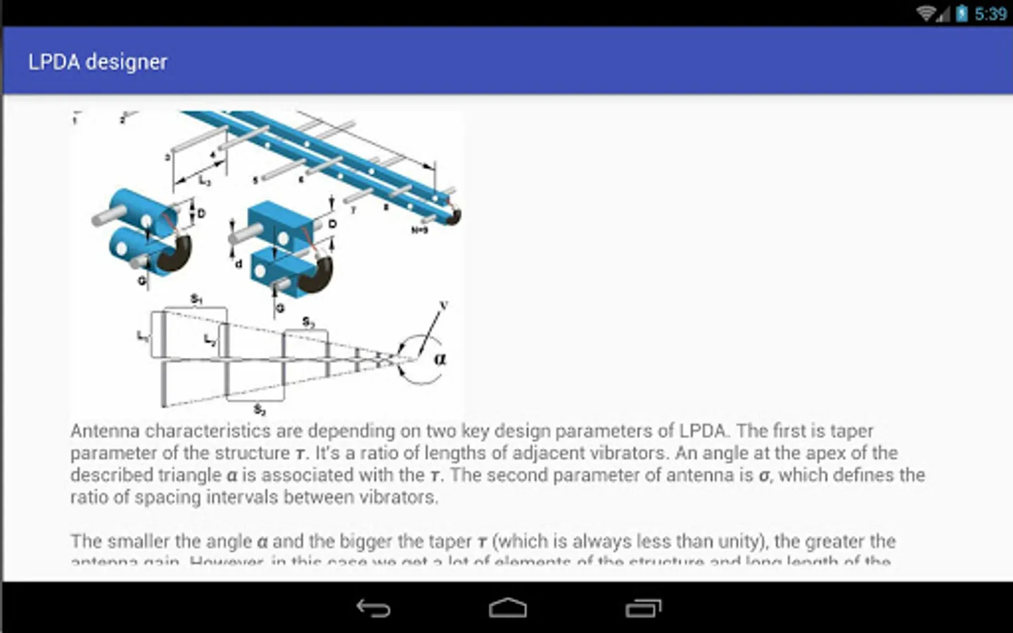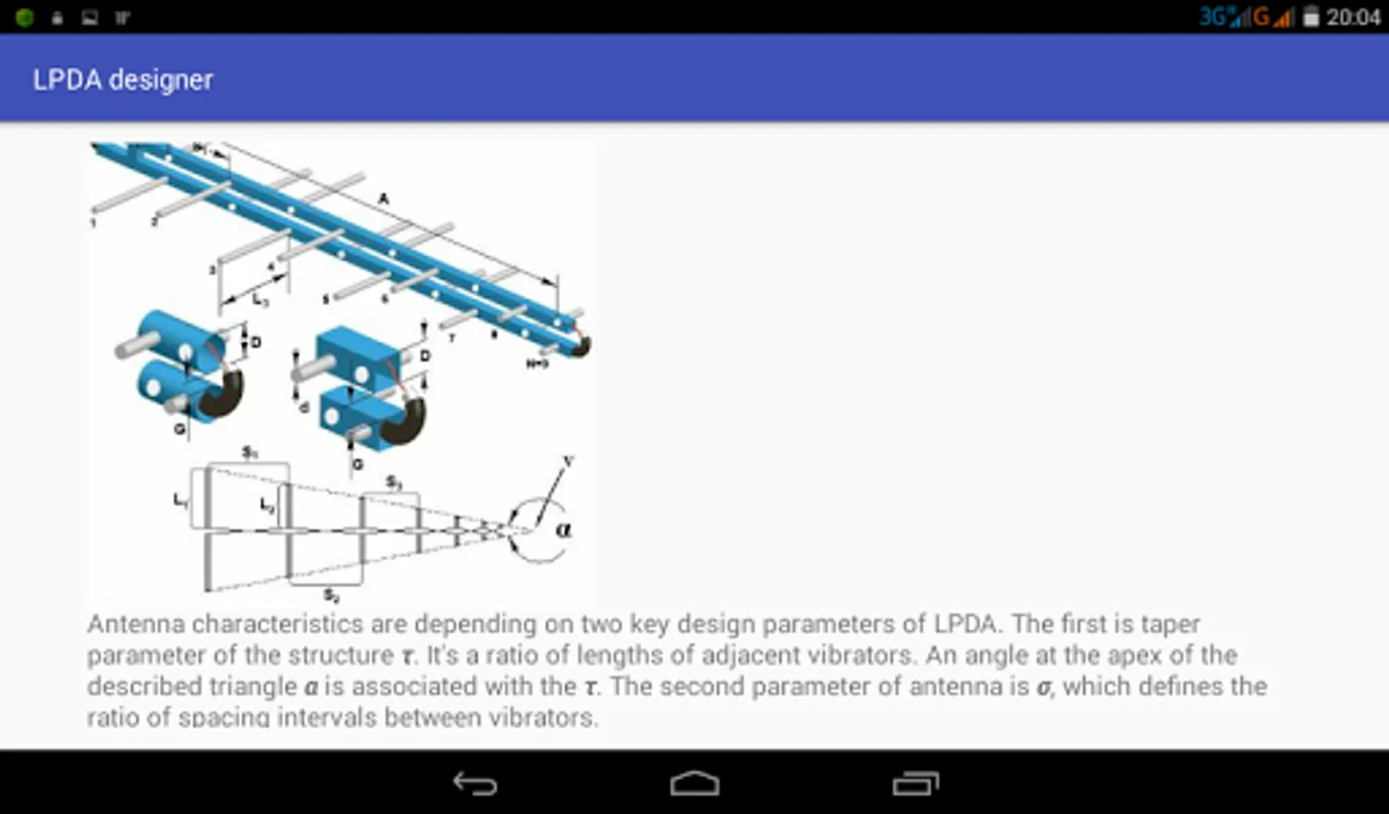 The app is intended to calculate and designing a home made log-periodic antenna (LPDA). The log-periodic antenna can be used in a number of applications where a wide bandwidth is required, such as Digital TV, Digital Networks etc.