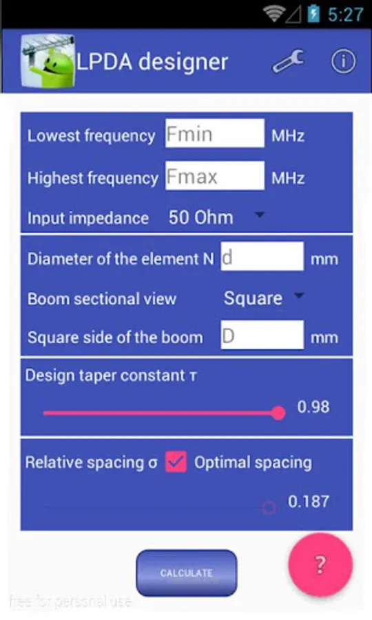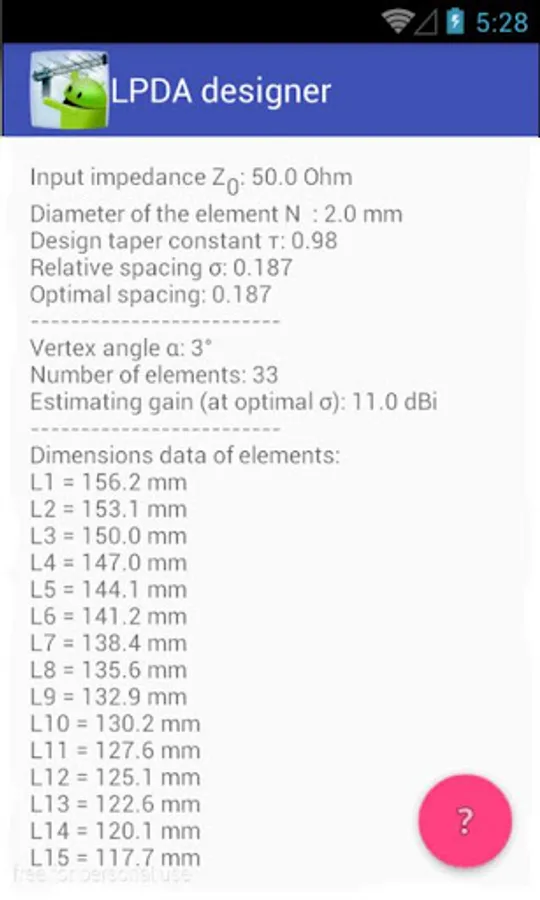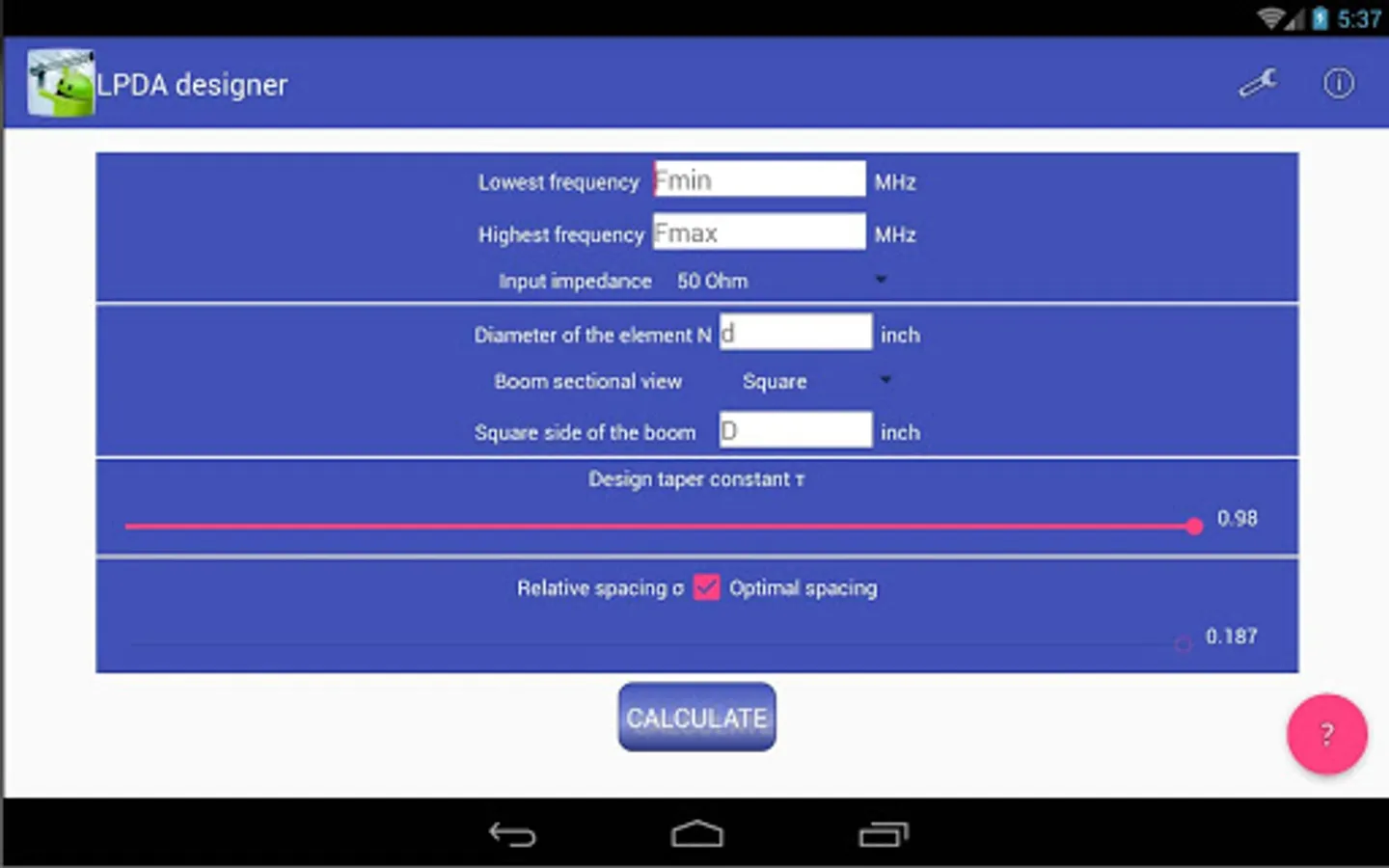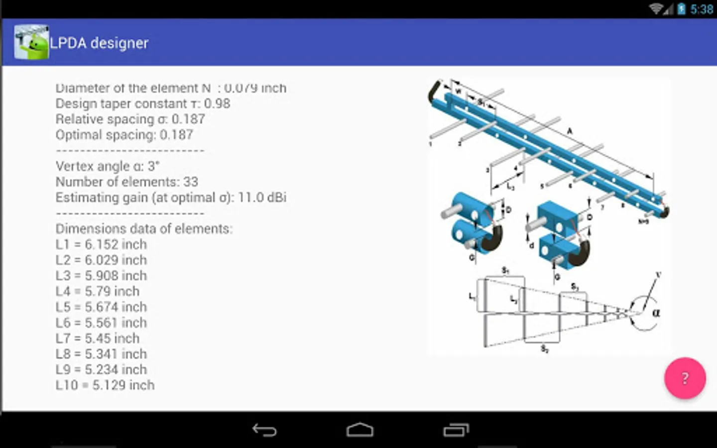 The app is intended to calculate and designing a home made log-periodic antenna (LPDA). The log-periodic antenna can be used in a number of applications where a wide bandwidth is required, such as Digital TV, Digital Networks etc.