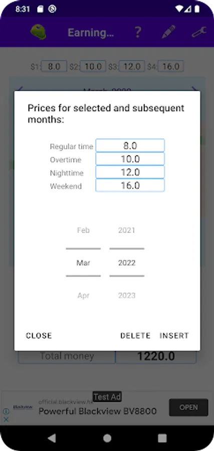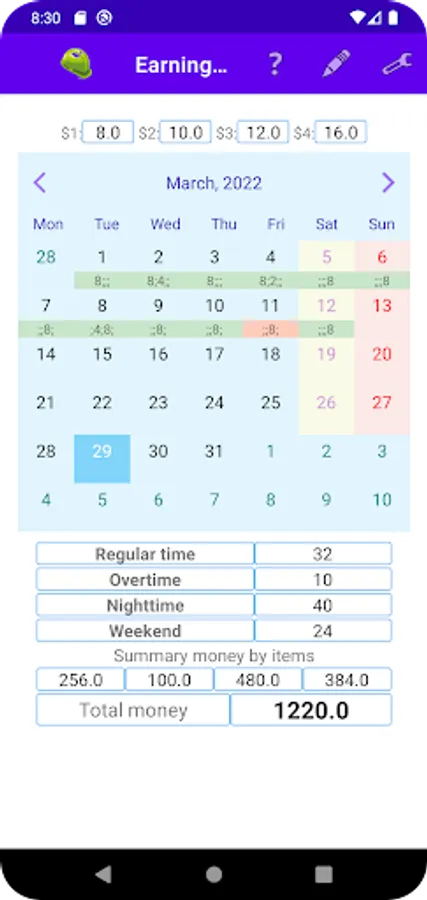 This application is intended primarily for the automatic calculation of your earnings at the factory for hourly wages. You need to record the number of hours worked daily. In addition, the possibility of a daily text commentary is provided. You can set a price for regular hours, overtime hours, and weekend hours. Prices are set for the selected month and all subsequent months until you set new prices. In addition, you can use the application to calculate earnings for piecework wages. In this case, you can change the names of the default items from hours to any other product or measure in which your work is calculated. For example, baskets, bags, square meters, etc.