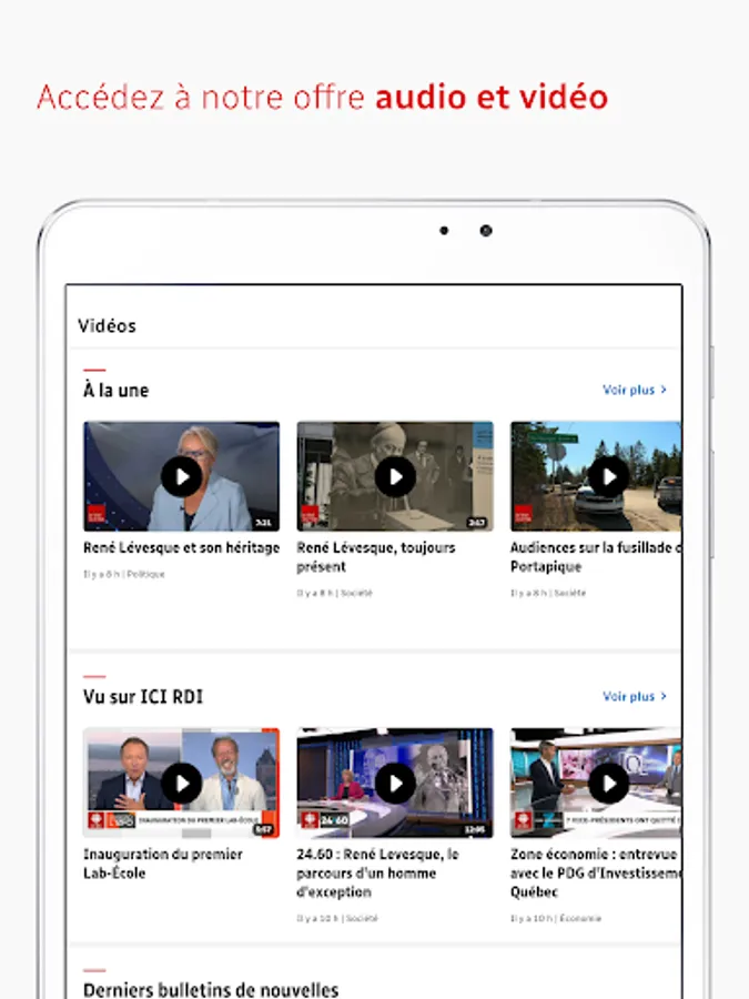 Accédez aux nouvelles internationales, nationales et régionales. Regardez les plus récents Téléjournaux et certaines émissions d'information de Radio-Canada. Consultez rapidement les nouvelles les plus récentes dans votre fil d'actualité en continu.