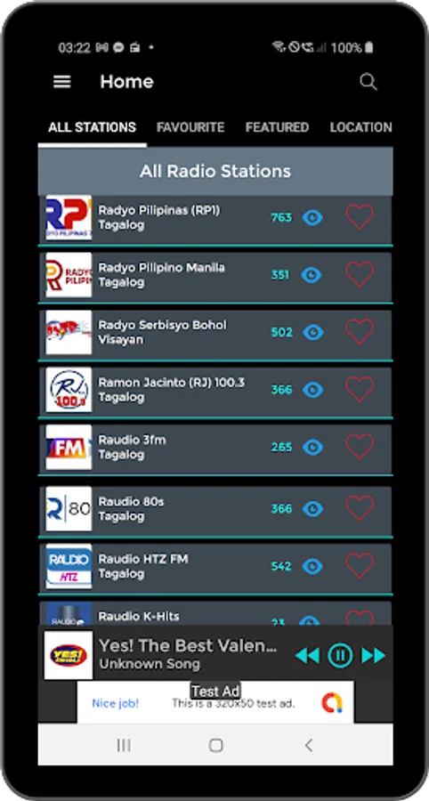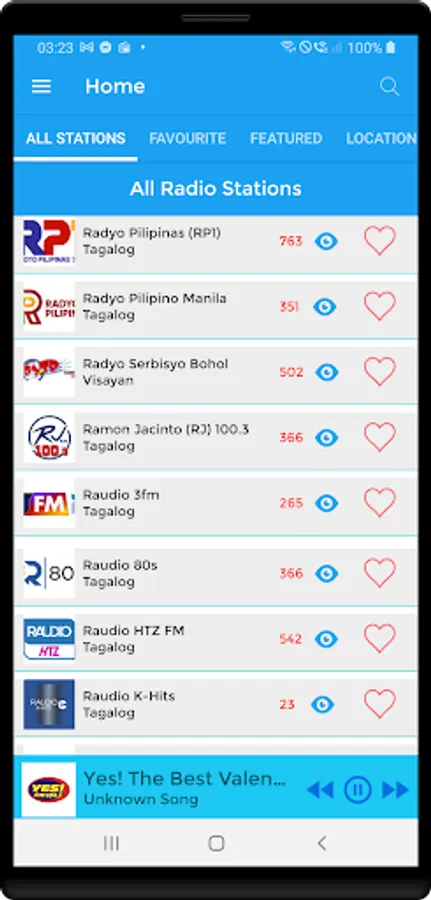 ☑️ Play any station in the list and add your favorites to favorite tab by clicking the heart icon next to the station.