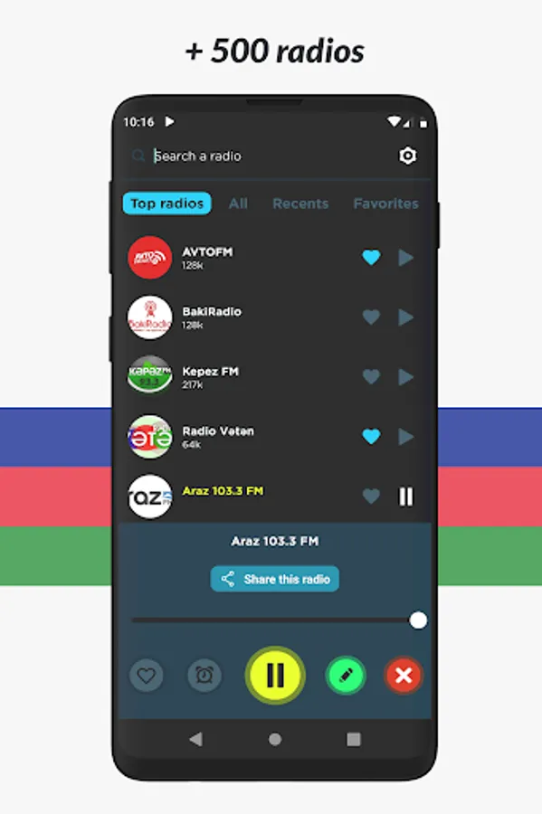 The ergonomics of Radio Azerbaijan has been studied to be the simplest and fastest radio application, thus offering you a fun and easy listening experience 😊