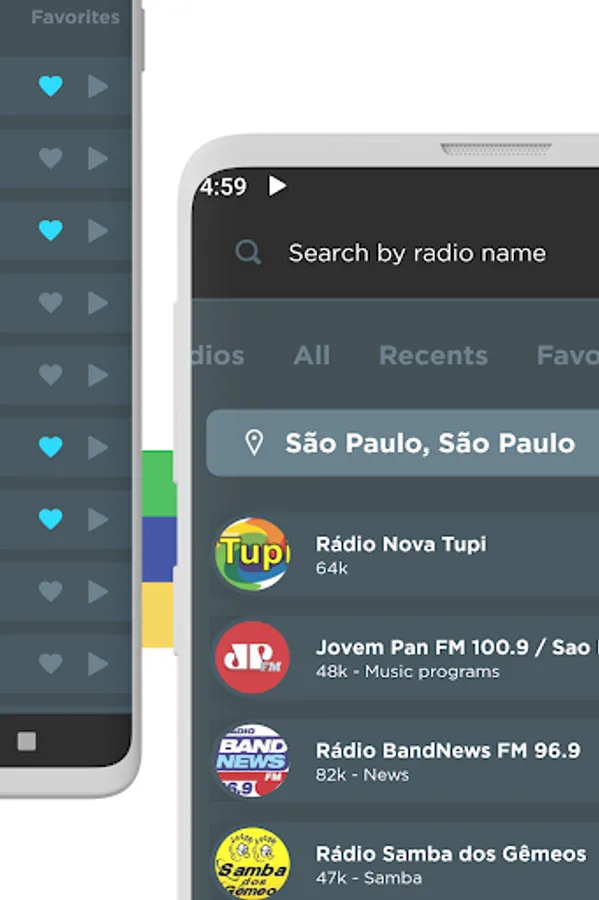 Listen to all your favorite radio stations like 98, Anos 80, Metropolitana, Motel, Romântica MPB, FlashBack, Sertaneja 106.7, Churrasco Sertanejo, Saudade, Roberto Carlos, Jovem Pan, Corno, Super Tupi, Viola de Ouro, Antena 1 and many more! And no matter what city or country you are in, you can listen to your favorite local radio station from anywhere in the world!