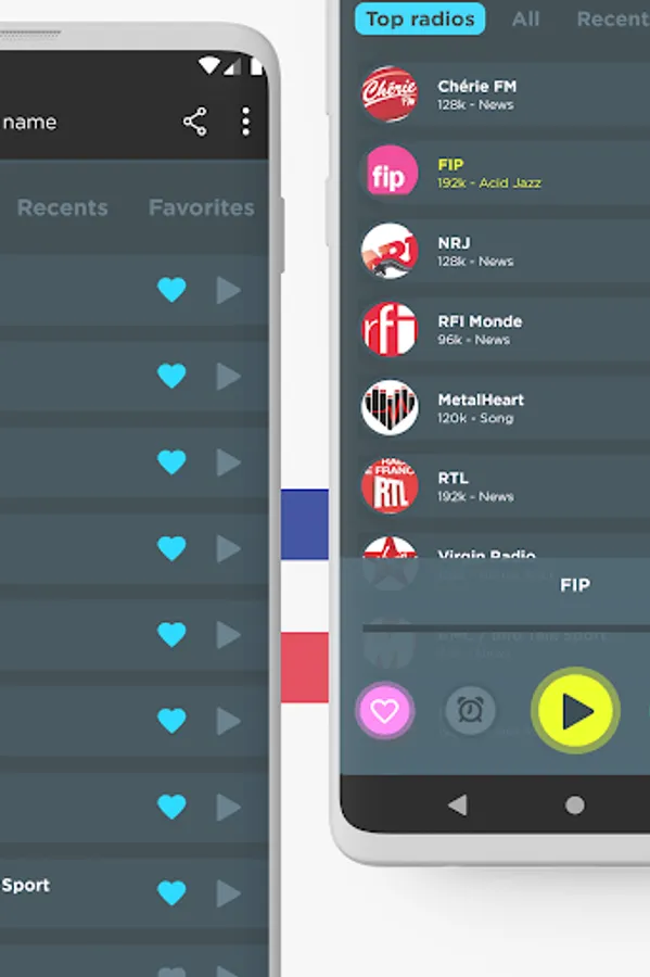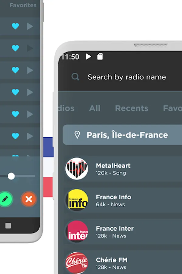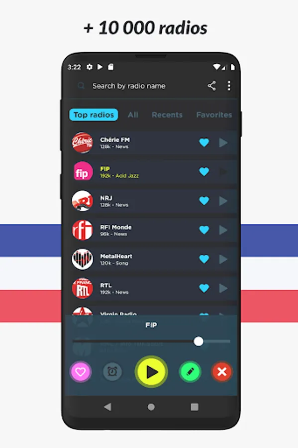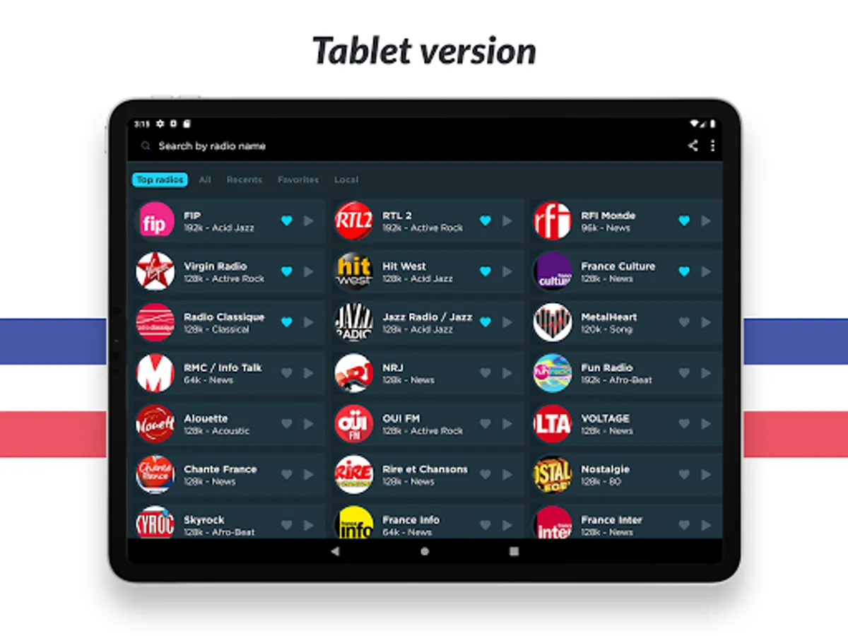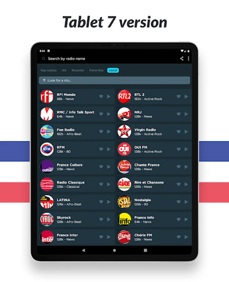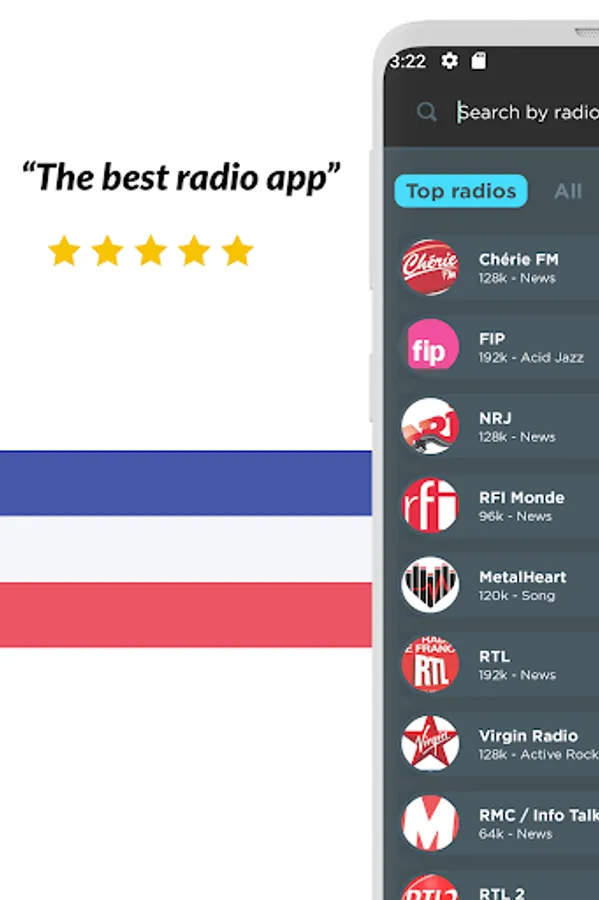 Listen to all your favorite radio stations like France Info, RFI Monde, Chérie, RTL, Fun, RMC, Nostalgie, NRJ HITS, Rire et Chansons, Classique, Skyrock, B Business, Virgin, LATINA, 100 % Français R and many more! And no matter what city or country you are in, you can listen to your favorite local radio station from anywhere in the world!