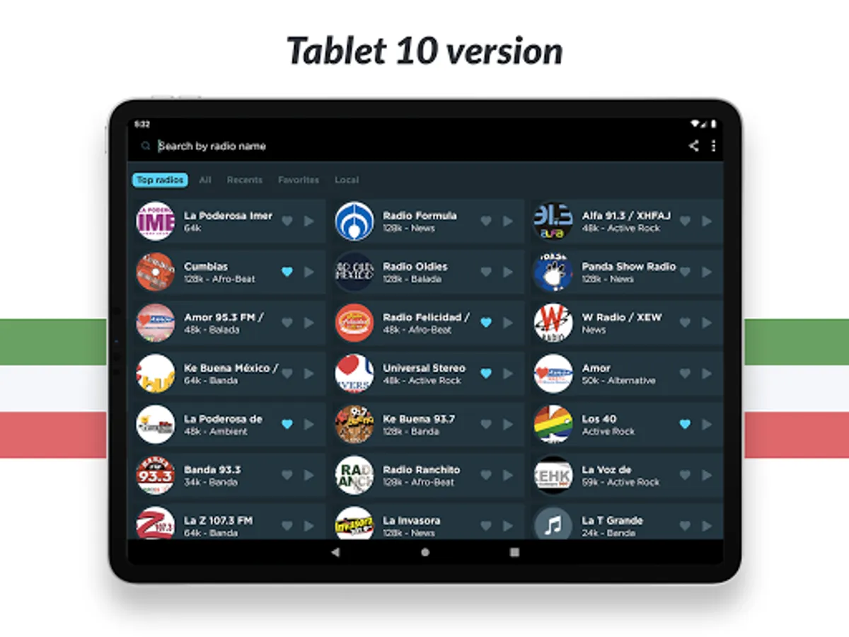 Listen to all your favorite radio stations like La Rancherita del Aire, Gallito, Cumbias Inmortales, Estrellas de los 80s, Miled Music Marco Antonio Solís, Ke Buena México, Café Romántico, El Fonógrafo XEJP, or 95.3 XHSH, Sabrosita 590 XEPH, Felicidad XEFR, Corridos Chingones, Variedades, Ranchito XERPA, Panda Show and many more! And no matter what city or country you are in, you can listen to your favorite local radio station from anywhere in the world!