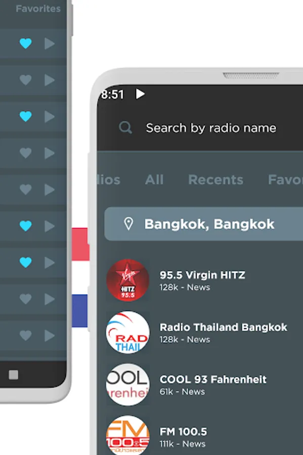 Listen to all your favorite radio stations like COOL 93 Fahrenheit, MCOT Active 99, 95.5 Virgin HITZ, Green Wave 106.5, Ondio Old, 101 Talk, 93.5 Happy Time, Live 104.2, Mun, 91.75 WatPakBo, One, JS 100, TV5 94 HD3, Met 107, Surf 102.5 and many more! And no matter what city or country you are in, you can listen to your favorite local radio station from anywhere in the world!