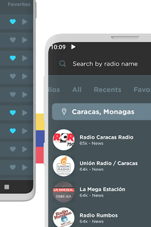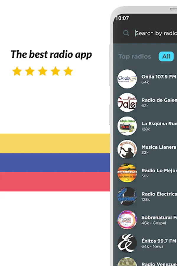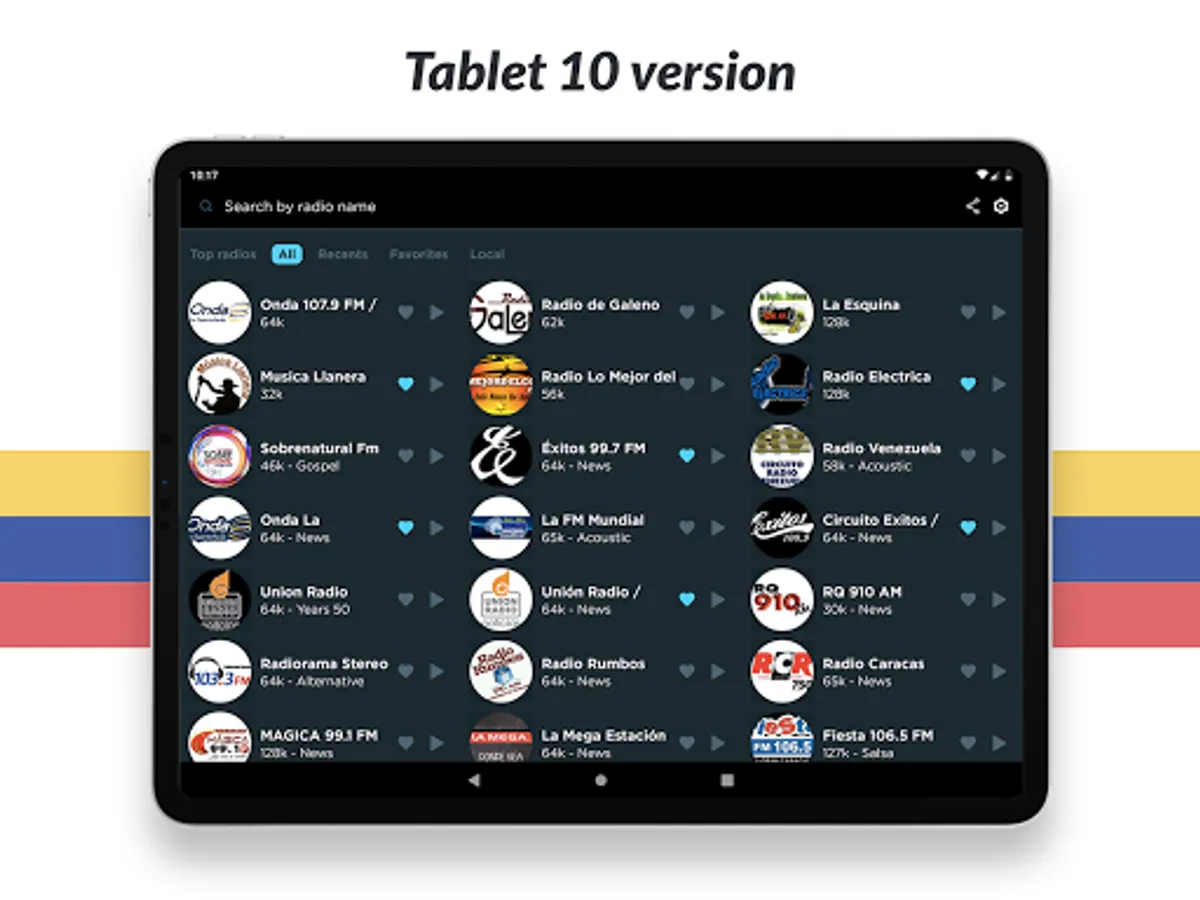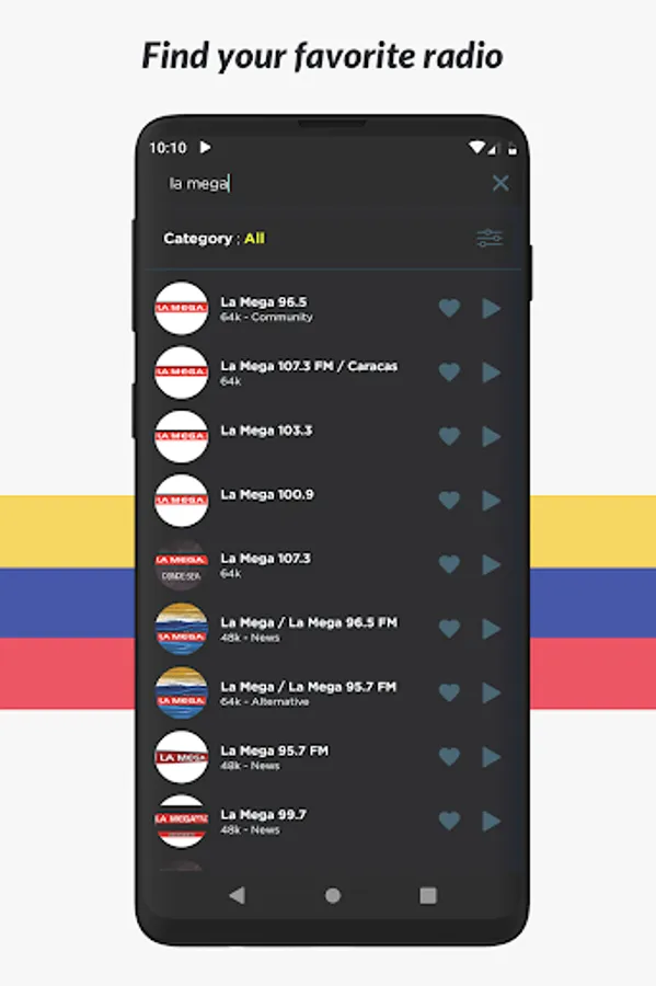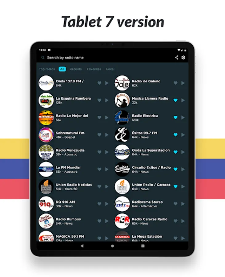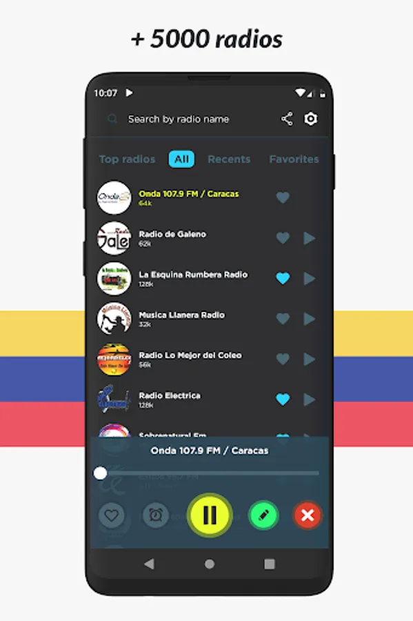 Listen to all your favorite radio stations like Noticias, La Mega Estación, Romance 93.1, Union 90.3, Rumbera, Fiesta Latina 106.1, Musica Llanera, Rumba 100.1 Barquisimeto, Recuerdos 1300, Planeta 105.3, Candela Pura, Sabrosa 90.1, Minuto 790, Salsa Baul Caracas, Sabor Latino HD and many more! And no matter what city or country you are in, you can listen to your favorite local radio station from anywhere in the world!