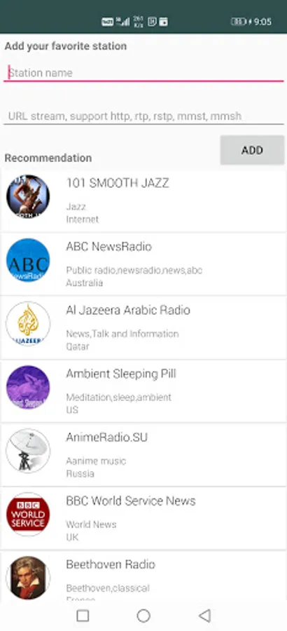 We also provide a simple way to add your favorite channels. Just use the "Add station" function and enter the URL you can have your own collection. Currently mp3, aac, pls, asx, m3u, m3u8 are supported.