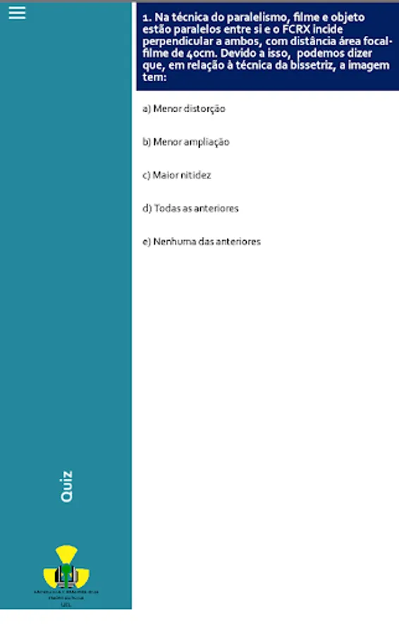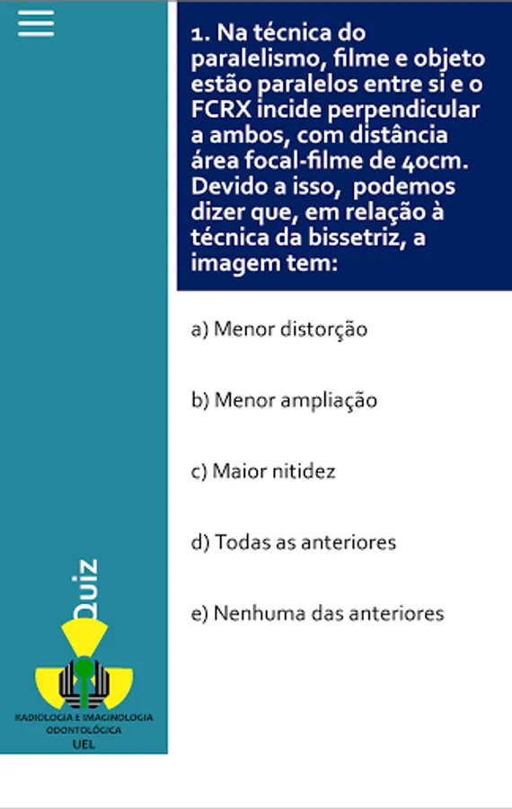 This version has the presence of a QUIZZ, where the user can test their knowledge before taking the radiograph! Through interactive buttons, users will be able to navigate easily and quickly through the chosen techniques.