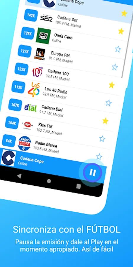 The most simple, fast and intuitive Spanish radio application. You can listen to your favorite Spanish radio stations in Android. And it's free! Enjoy it!
