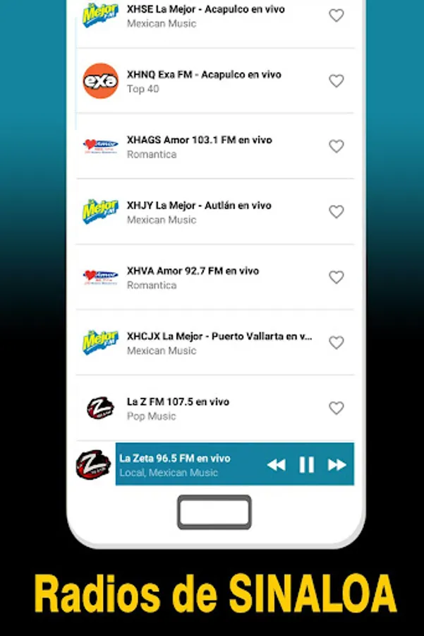 Radios de Sinaloa con un interfaz moderno y elegante, además tienes la opción de seleccionar un acceso súper rápido a tu Radio Sinaloa favorito.