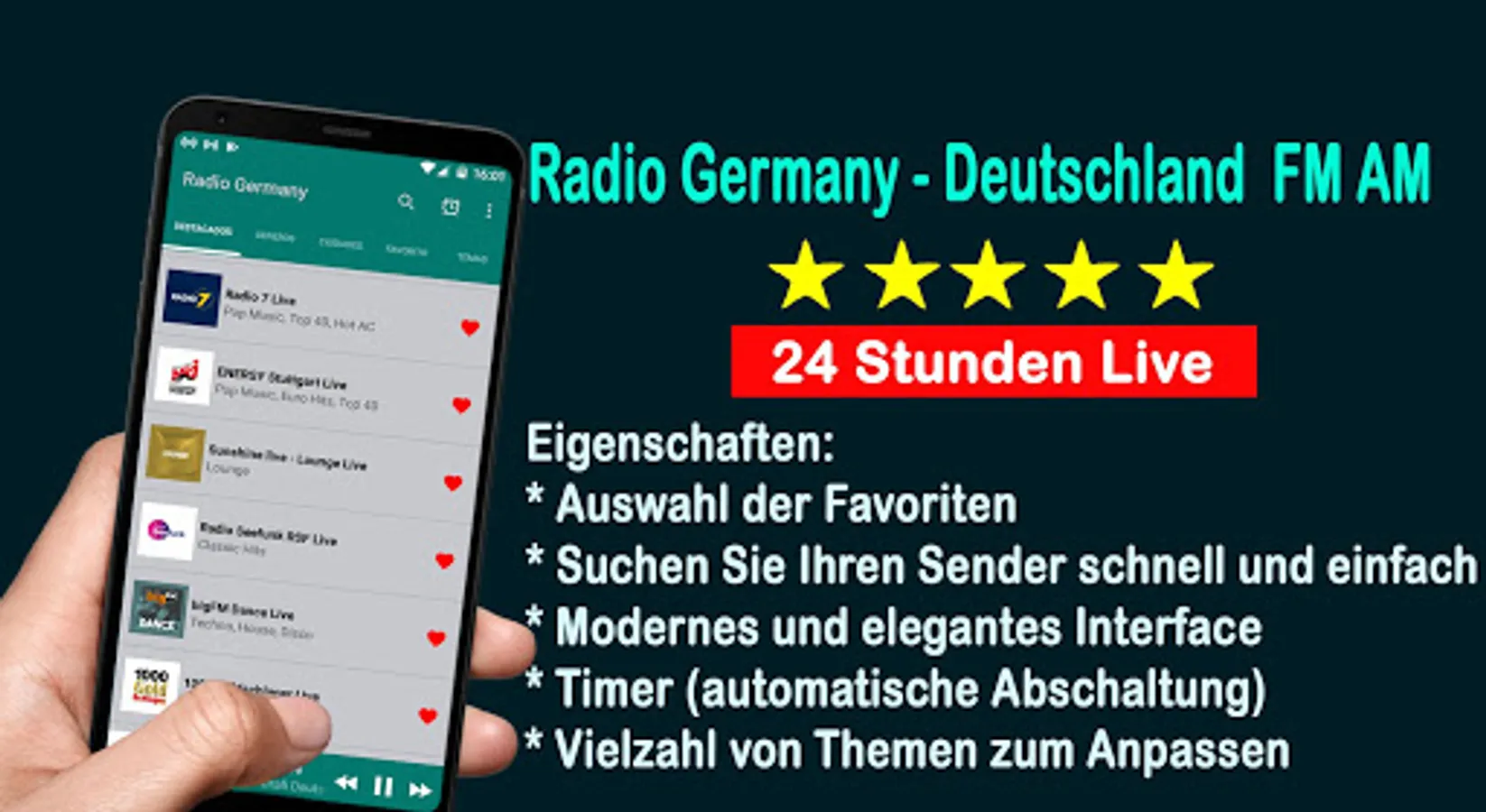 Enjoy the new trend when listening to Radio German live for free with our app, it is a collection of the best Germany radio station for free live.