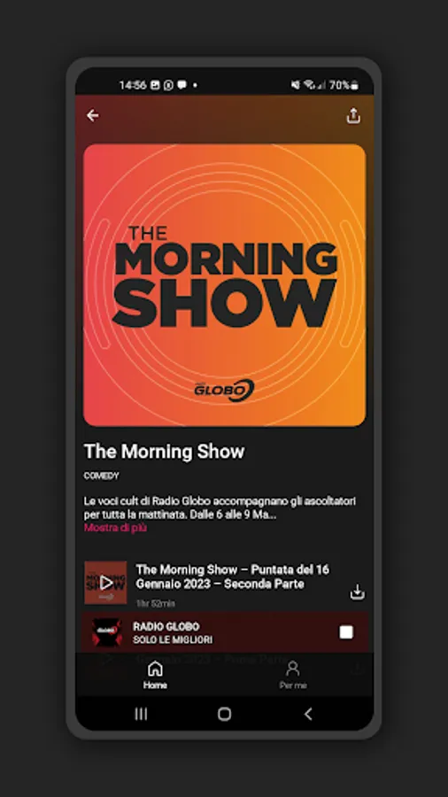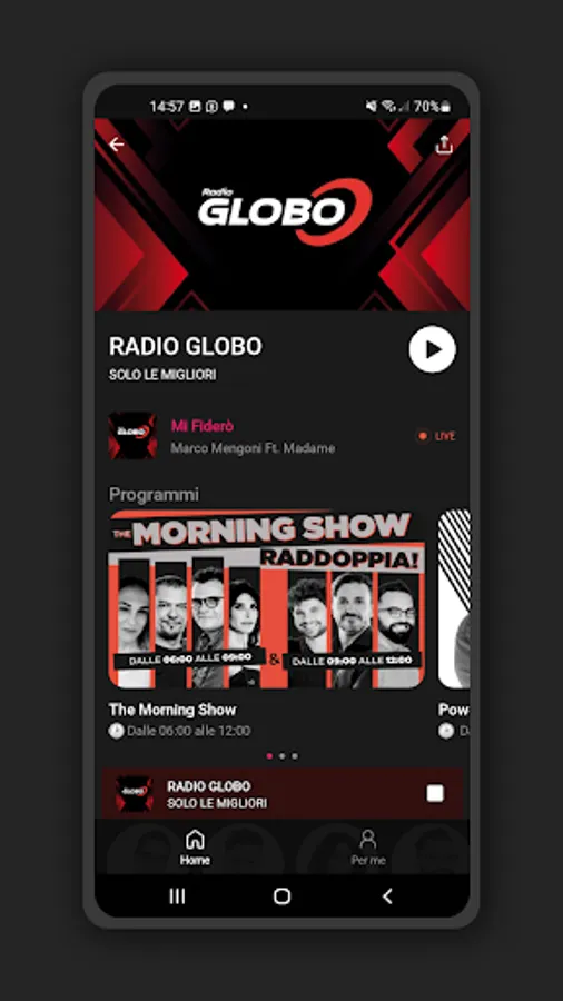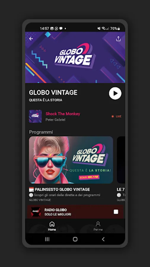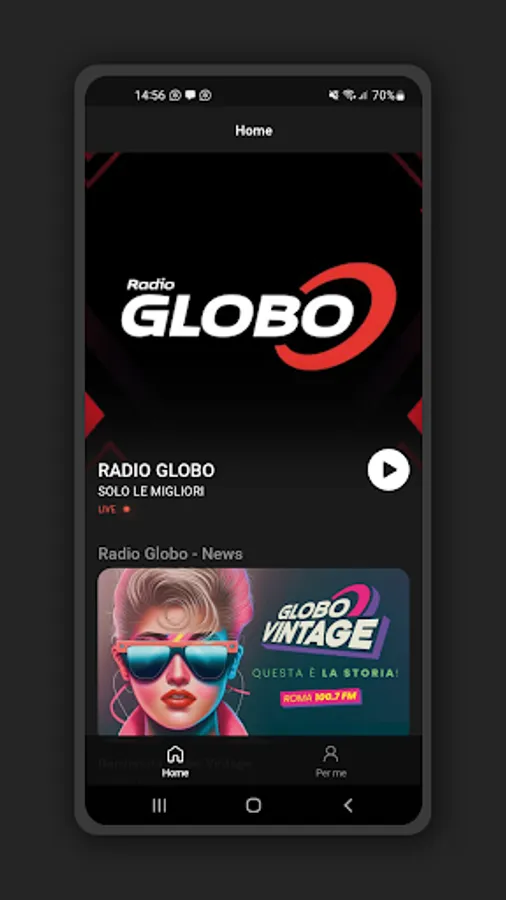 Con la nostra app puoi ascoltare la diretta e i podcast di Radio Globo e Globo Vintage. Porta ovunque con te la musica di Radio Globo e il meglio della musica 70-80-90 di Globo Vintage. Grazie alle notifiche push resti sempre aggiornato su tutte le iniziative di Radio Globo e Globo Vintage. L'applicazione è compatibile con Android Auto.