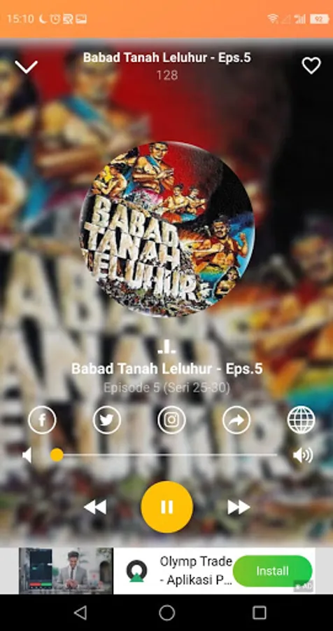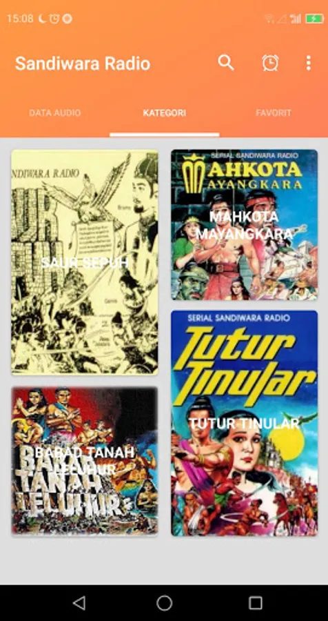 The application contains audio recordings of various radio plays, such as: Babad Tanah Leluhur, Tutur Tinular, Mahkota Mayangkara, Saur Sepuh, etc.