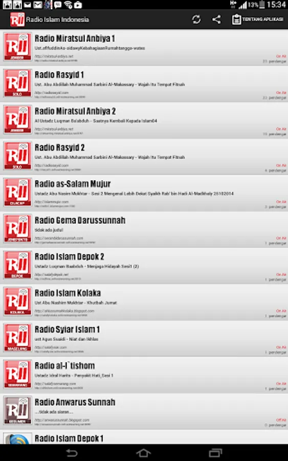 Radio Islam Indonesia is an app collecting several online streaming islamic radios which base their broadcasted lessons on al-Qur'an and As-sunnah, in Arabic language and Bahasa Indonesia.