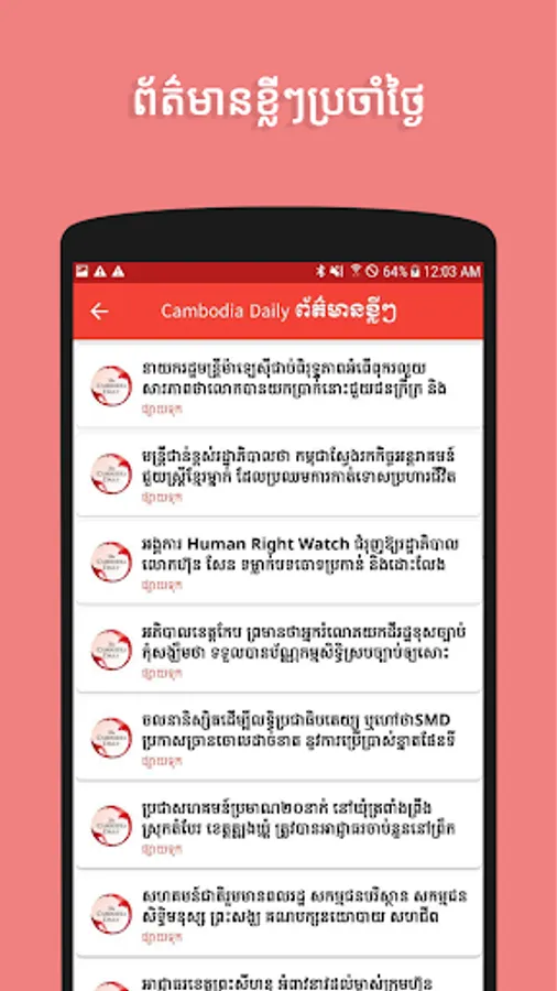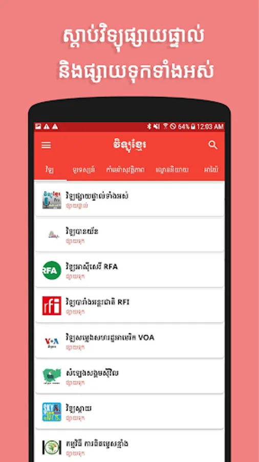 Radio Khmer contains a lot of FM & AM radios in Cambodia including archived podcasts for popular channel such as Radio Free Asia(RFA), Radio French International(RFI), Voice of America(VOA), Voice of Democracy(VOD), The Cambodia Daily....