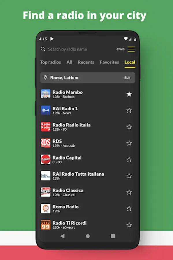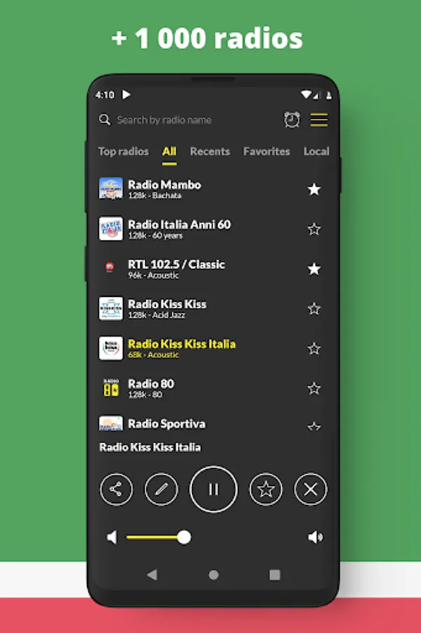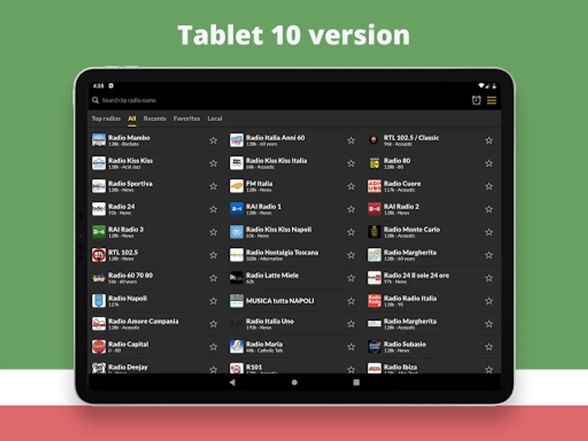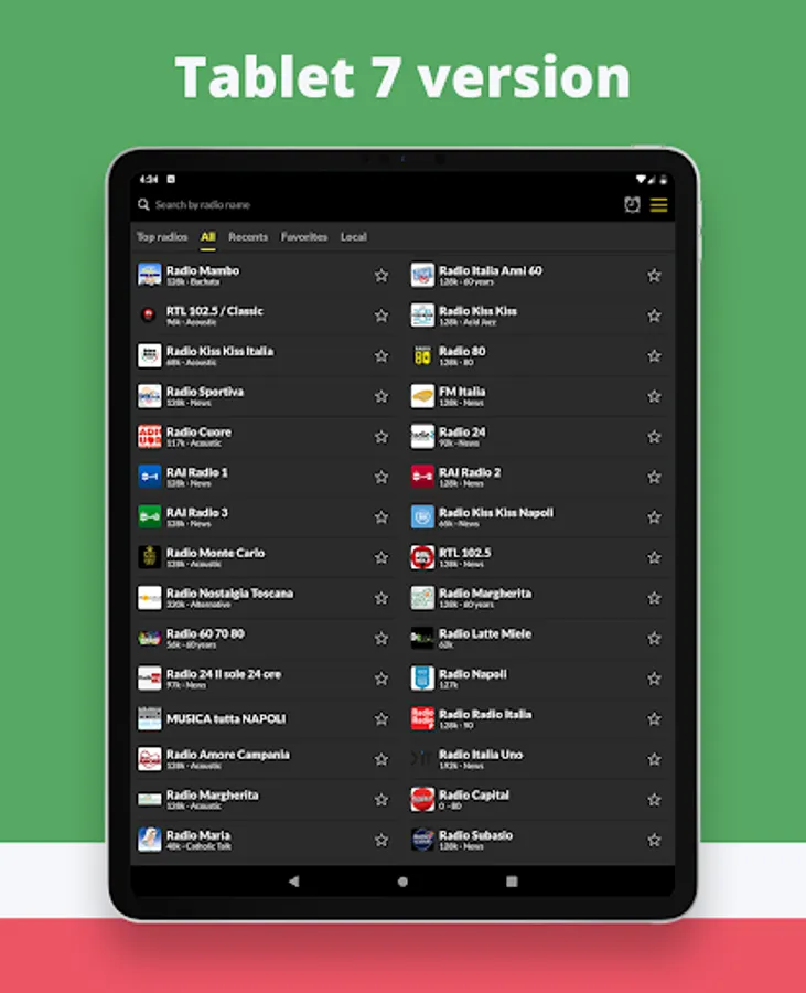 With an easy to use, fast and modern interface, Radio Italy offers you the best online listening experience without subscription or payment to access the application! Also take advantage of our widget for even more pleasant and simple access and listening!
