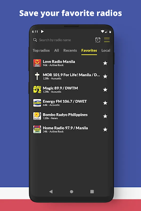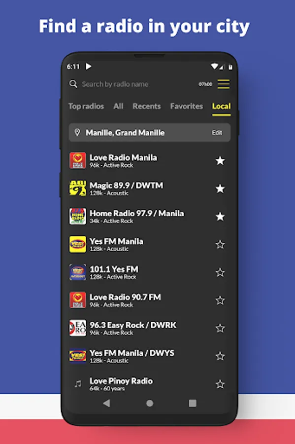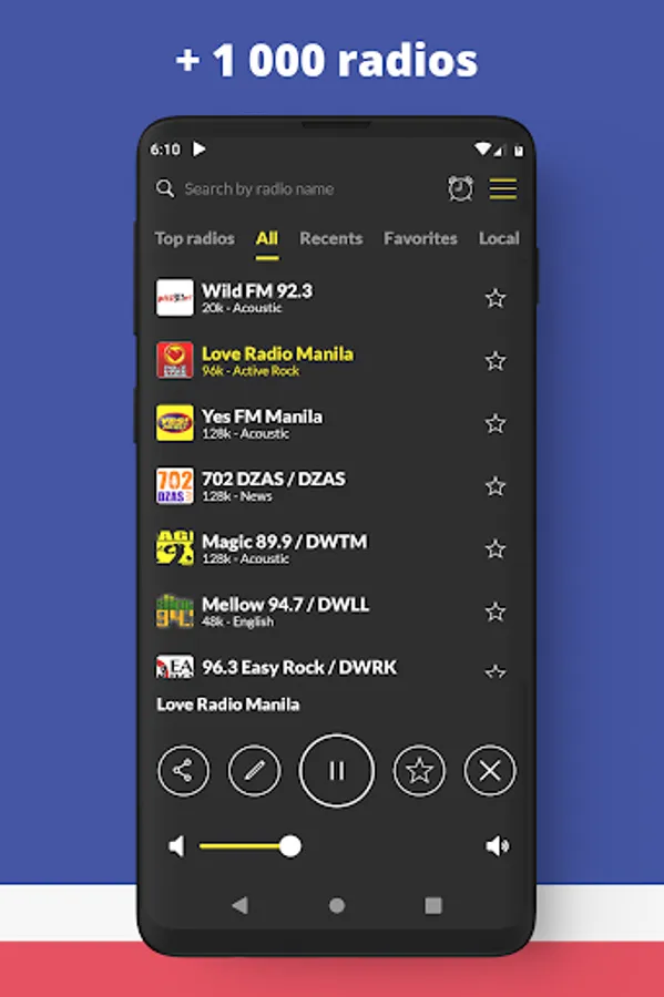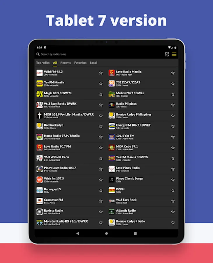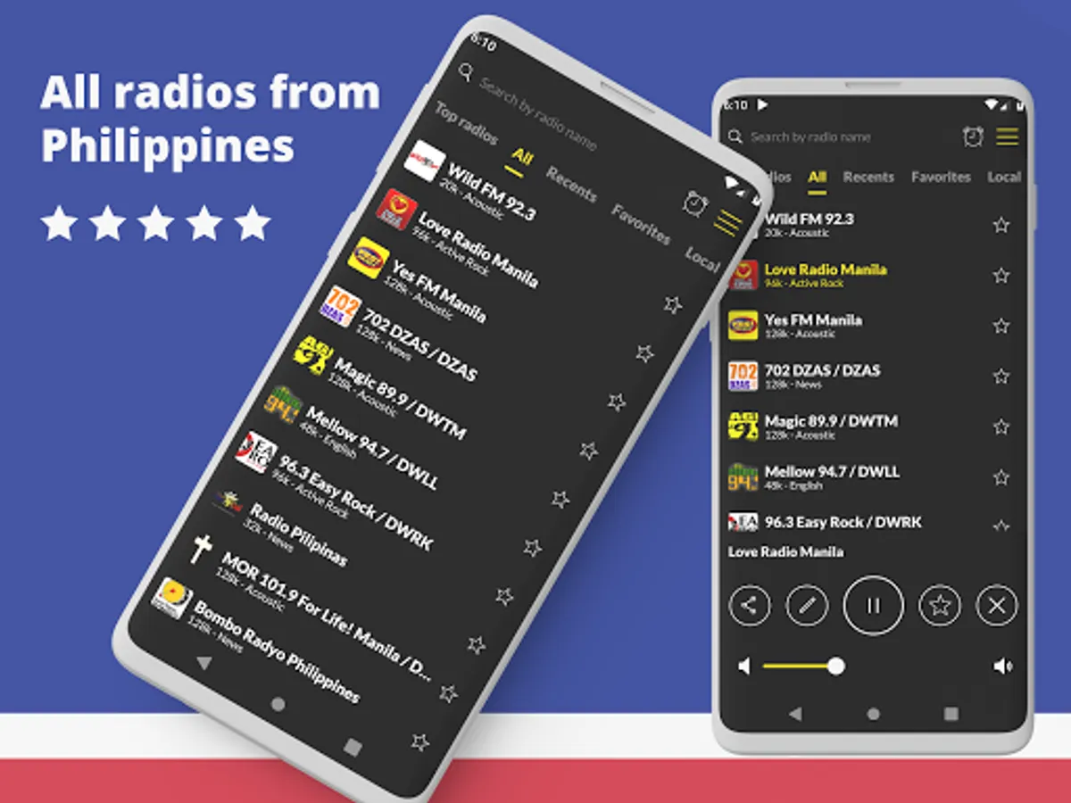 With an easy to use, fast and modern interface, Radio Philippines gives you the best online listening experience without any subscription or payment to access the app! Also take advantage of our widget for even more pleasant and simple access and listening!