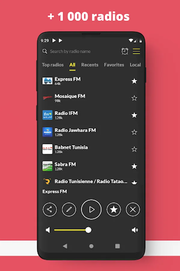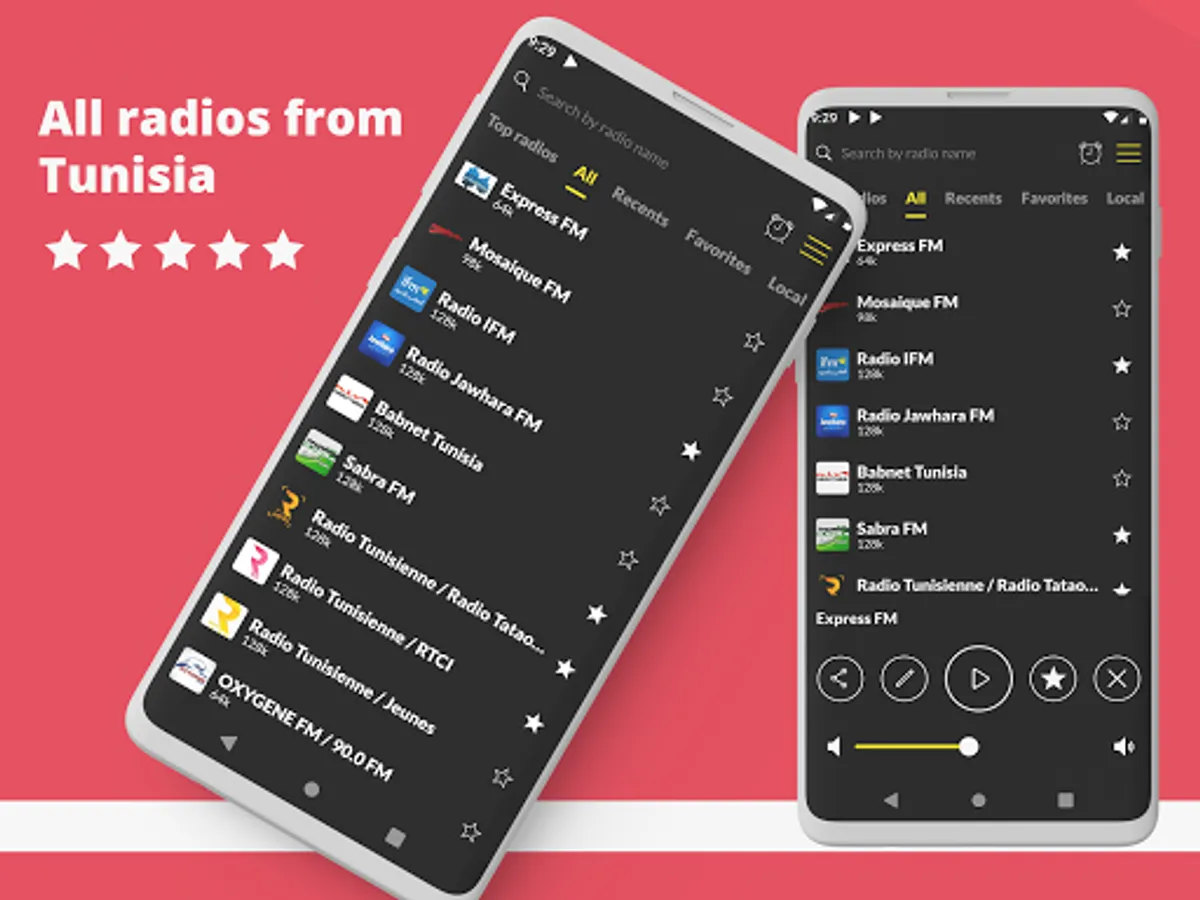 With Radio Tunisie, listen to all your favorite radio stations like Express, Tataouine, Nationale, Shems 88.7, Mosaique Tunisie, I, Sfax, Monastir, Ulysse, OXYGENE, Sabra, Jawhara, Zitouna, Babnet Tunisia, Kara and discover many other radio stations thanks to our suggestions!