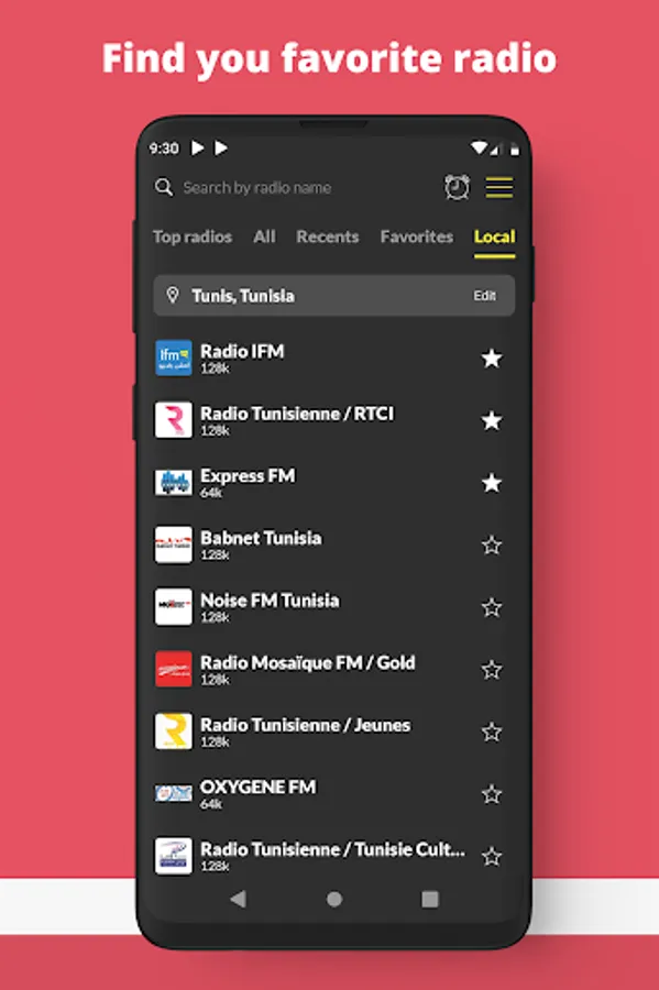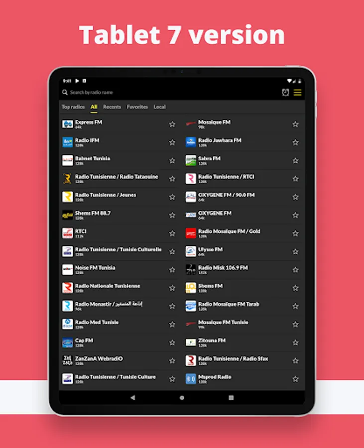 With an easy to use, fast and modern interface, Radio Tunisie offers you the best online listening experience without subscription or payment to access the application! Also take advantage of our widget for even more pleasant and simple access and listening!