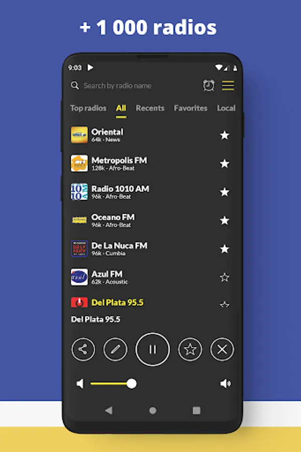 With Radio Uruguay listen to streaming all your favorite radio stations like De La Nuca, Universal 970, Aire 100.3, Inolvidable, Del Sol, Carve 850, SarandΓ, Monte Carlo, Urbana 92.5, Oriental 770, Sport 890, El Espectador, Cero, 1010, Oceano and discover many other radios thanks to our suggestions!