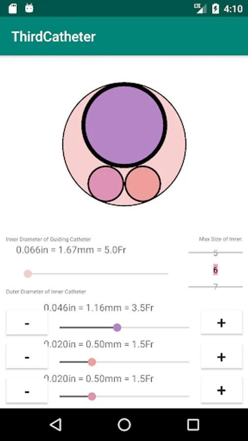 This App calculate the required minimum diameter of a circle inscribing three circles circumscribing each other based on Soddy circles and intuitively displays the relative size of the circle. You can calculate the theoretical minimum diameter of the guiding catheter when using three devices.Please note that the space required for the device to function is not considered.