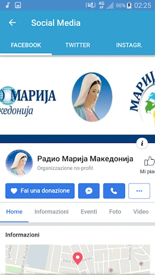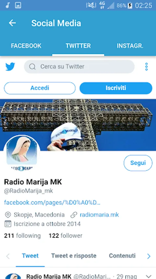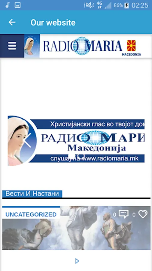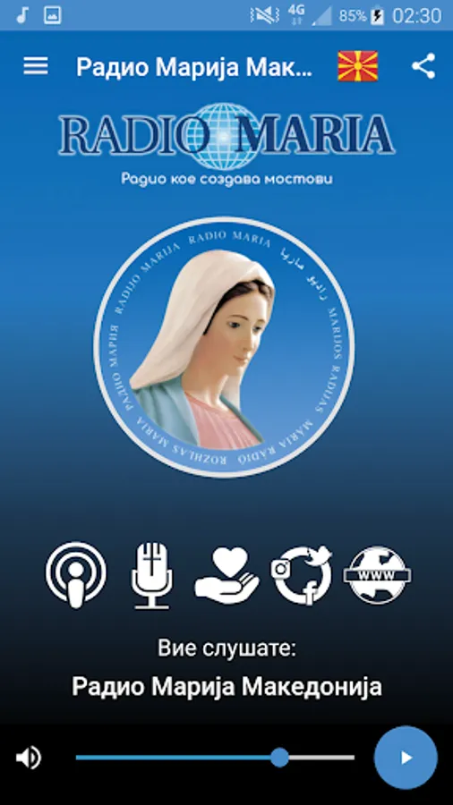 Radio Maria Macedonia is a web radio station operating in Macedonia since 2014. As part of the World Family of Radio Maria, it complies with all the standards required for a radio of the type. The basic contents of our radio are of religious subject in order to develop the spiritual aspect of the human personality. Besides religious contents, our program involves other contents related to everyday life. It abounds with contents exerting educational and instructional influence on the audience, and in this sense, one of the main objectives of our contents is the contribute to awareness raising for solidarity. Web radios offer a great possibility for innovations as well as for the use of new integrated contents presentation methods which should be transmitted to the audience.