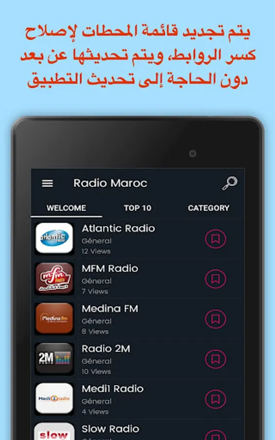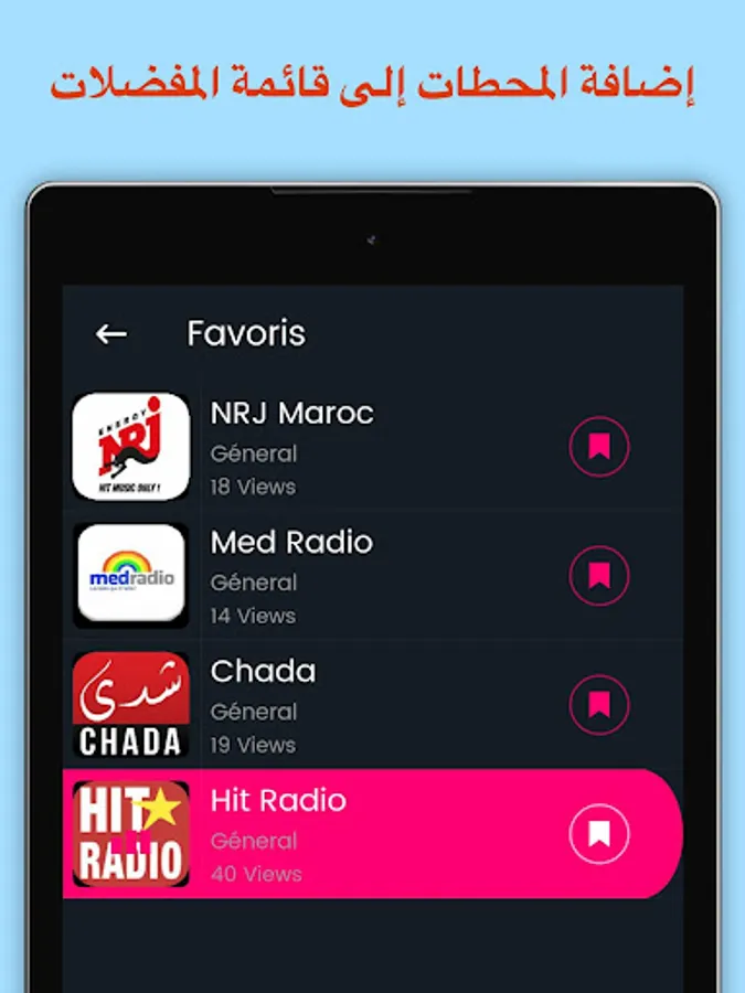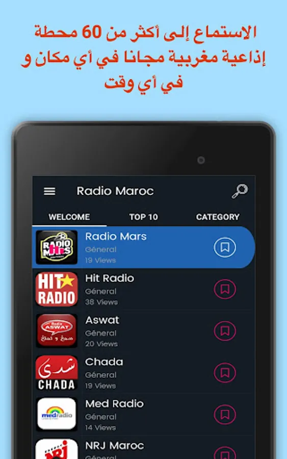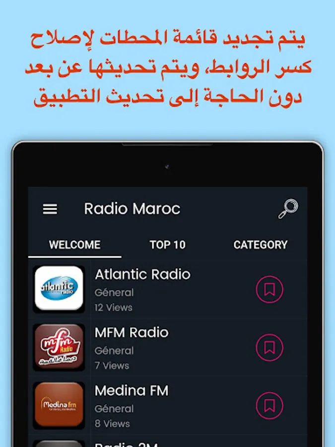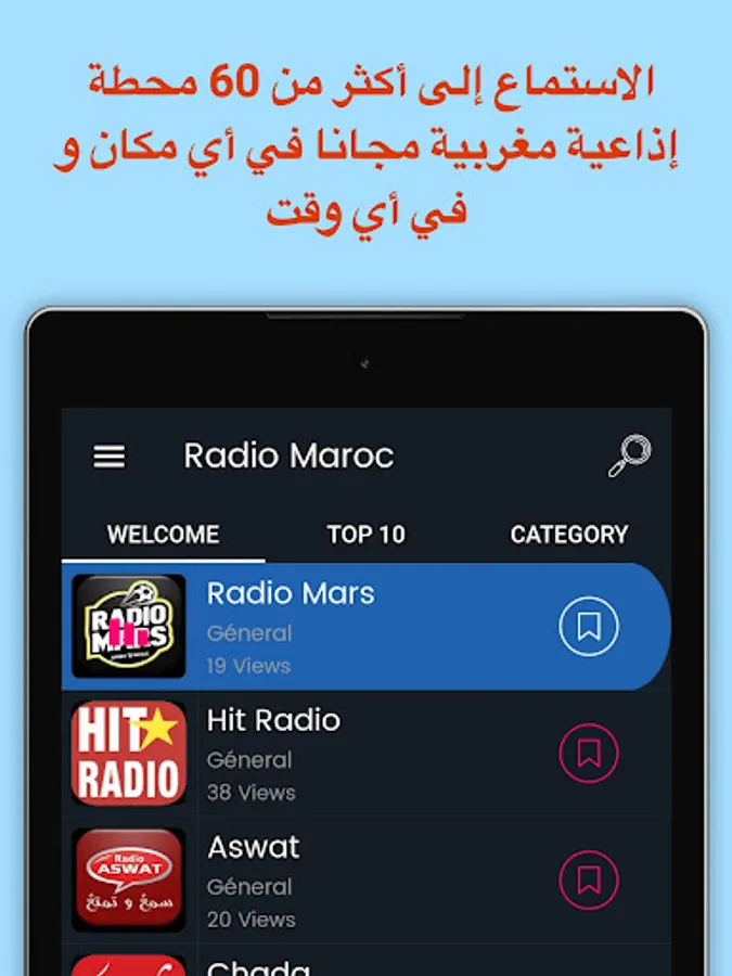 The Radios Stations: - Medi 1 - 2M - Aswat - Maroc Music - Atlantic - Hit Radio - Med Radio - Radio Mohamed 6 - Radio Mars - Cap Radio - Chada FM - Medina FM - Mgharba - Chaine Inter - Dancefloor - luxe radio - Casa FM - 100% French - Yabiladi - SNRT Amazigh - Radio Orient - coran