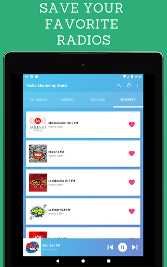 Browse quickly through hundreds of stations available throughout Radio Monterrey Free - Stations of Nuevo Leon and search by region for the station you want to listen to. You can search by the name of the station or by the region of the desired radio. You can put your favorite radios so you do not have to search for them again.
