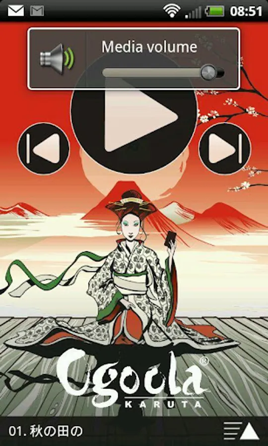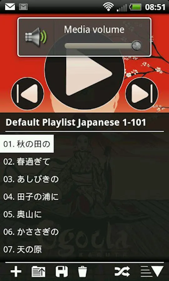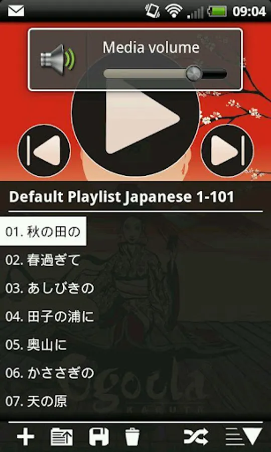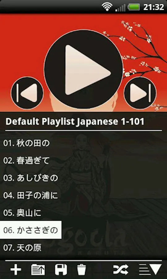 小倉百人一首読み上げアプリ(Android)。田邨将軍堂製作。日本かるた院会員田邨栄造朗詠。百人一首の100首の和歌と序歌、計101首朗詠。序歌は日本かるた院の「しのばれん物ともなしにをぐら山軒ばの松ぞなれて久しき」という歌が入っています。鑑賞用。百人一首かるた遊び兼練習用。シャッフルランダム機能、自分のプレーリスト作成機能付。尚、このアプリはAndroid Go ヴァージョンは機能が不可能です。