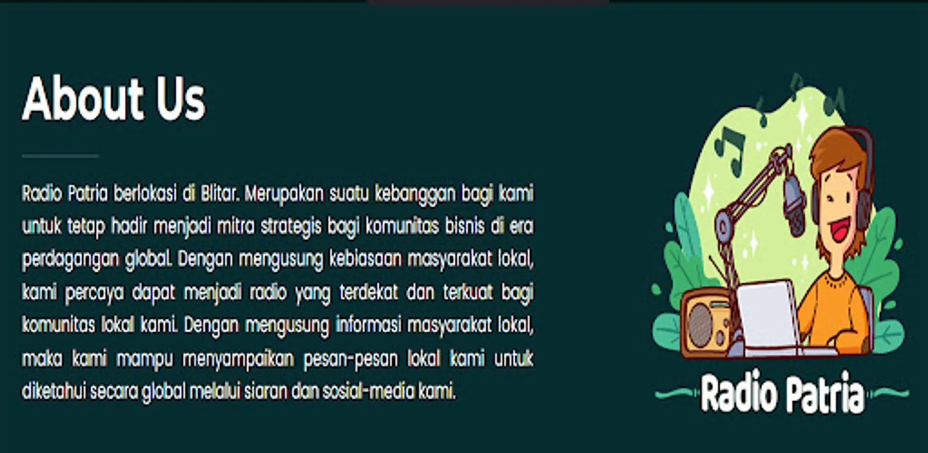 Radio Patria is located in Blitar. It is an honor for us to continue to be a strategic partner for the business community in the era of global trade. By carrying out the traditions of the local community, we believe we can become the closest and strongest radio for our local community. By carrying local community information, we are able to convey our local messages to be known globally through broadcasts and our social media