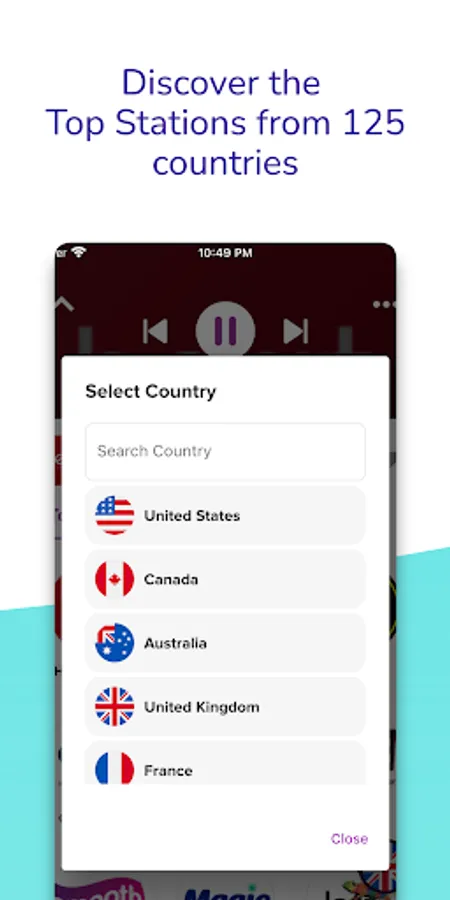 - Pressing the circle with your country's flag will display a list of 125 countries to select and listen to, with one click, the top stations of each country.