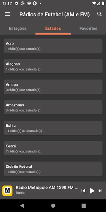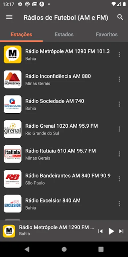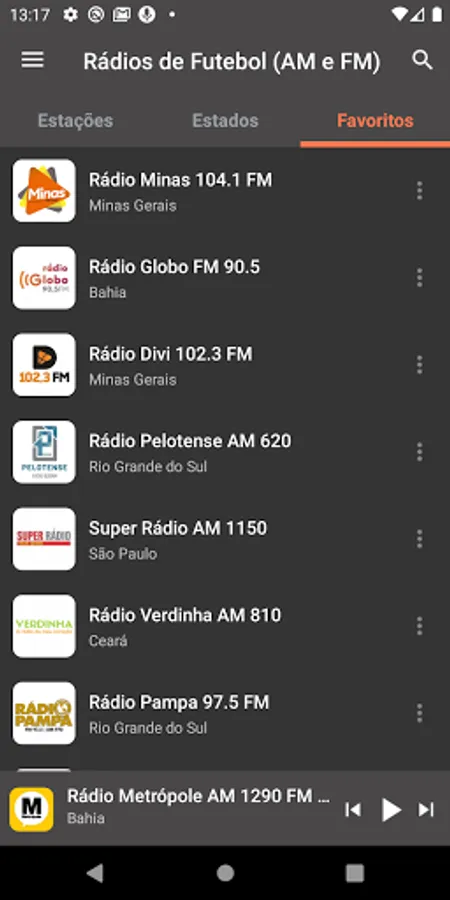 The best football radio stations in Brazil: "Rio Branco (Acre)", "João Pessoa (Paraíba)", "Curitiba (Paraná)", "Maceió (Alagoas)", "Macapá (Amapá)", "Vitória (Espírito Santo) ) "," Fortaleza (Ceará) "," Brasília (Distrito Federal) "," Natal (Rio Grande do Norte) "," Porto Alegre (Rio Grande do Sul) "," Porto Velho (Rondônia) "," Boa Vista (Roraima) "," Florianópolis (Santa Catarina) "," Recife (Pernambuco) "," Teresina (Piauí) "," Goiânia (Goiás) "," São Luís (Maranhão) "," Cuiabá (Mato Grosso) ", "Campo Grande (Mato Grosso do Sul)", "Rio de Janeiro (RJ)", "Manaus (Amazonas)", "Salvador (Bahia)", "São Paulo (São Paulo)", "Belo Horizonte (Minas Gerais) "," Belém (Pará) "," Aracaju (Sergipe) "," Palmas (Tocantins) "and many other capitals and cities.