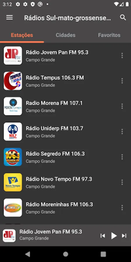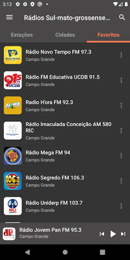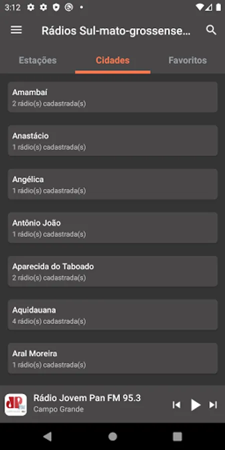 Radios from all over the state: "Campo Grande", "Dourados", "Três Lagoas", "Corumbá", "Ponta Porã", "Sidrolândia", "Naviraí", "NovaAndradina", "Aquidauana", "Maracaju", " Paranaíba", "Amambai", "Rio Brilhante", "Coxim", "Caarapó" and many other municipalities in Mato Grosso do Sul.