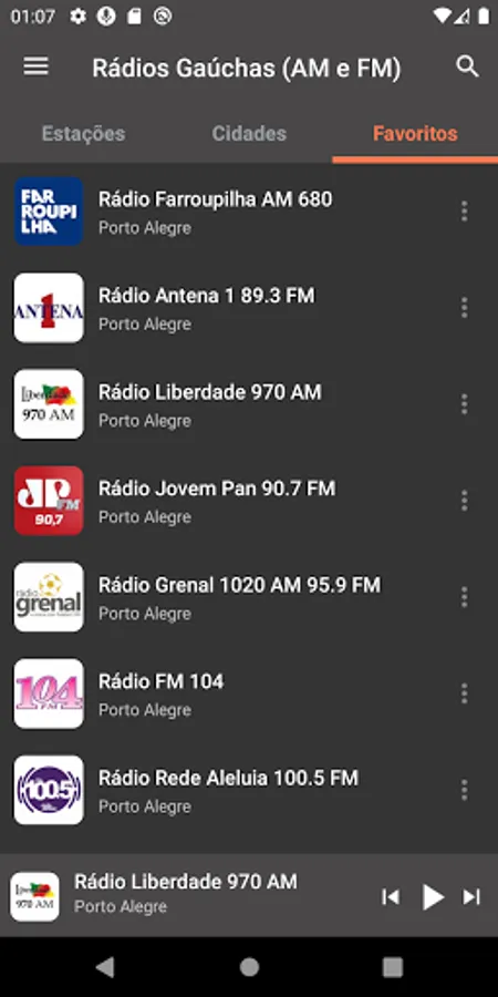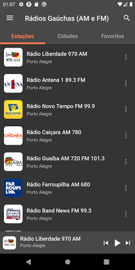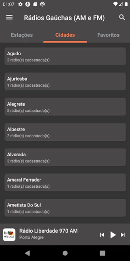 Radios from all over the state of Rio Grande do Sul: "Porto Alegre", "Gravataí", "São Leopoldo", "Rio Grande", "Alvorada", "Passo Fundo", "Bagé", "Santa Cruz do Sul", "Caxias do Sul "," Pelotas "," Canoas "," Sapucaia do Sul "," Uruguaiana "," Novo Hamburgo "," Santa Maria "," Cachoeirinha "," Viamão "," Bento Gonçalves "," Erechim "," Guaíba " and many other gaucho municipalities.