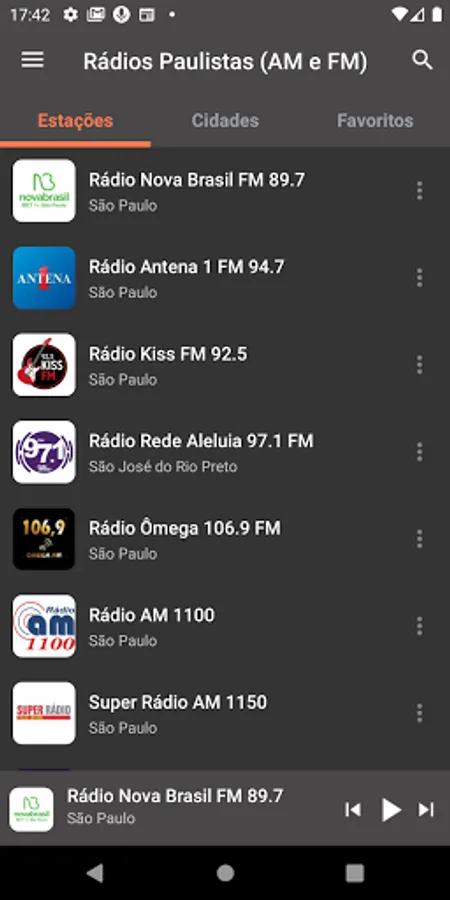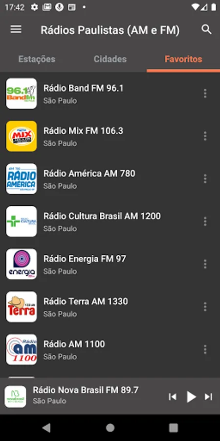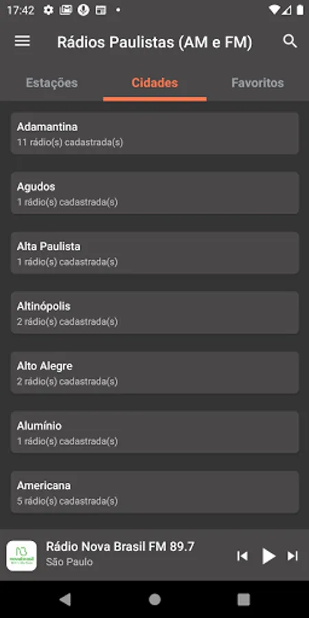 Radios from all over the state of SP: "Guarulhos", "Ribeirão Preto", "Osasco", "Sorocaba", "Campinas", "São Bernardo do Campo", "São José dos Campos", "Marília", "Mogi das Cruzes "," Santos "," Mauá "," Taubaté "," Limeira "," Jundiaí "," Piracicaba "," Carapicuíba "," Cotia "," Americana "," Itaquaquecetuba "," São Vicente "," Franca "," Itapevi "," Araraquara "," Bauru "," Santo André "," Embu das Artes "," São Carlos "," Indaiatuba "," Praia Grande "," Guarujá "," Jacareí "," Hortolândia " , "Suzano", "Taboão da Serra", "Sumaré", "Barueri", "São José do Rio Preto", "Diadema", "Presidente Prudente", "Rio Claro" and many other municipalities.