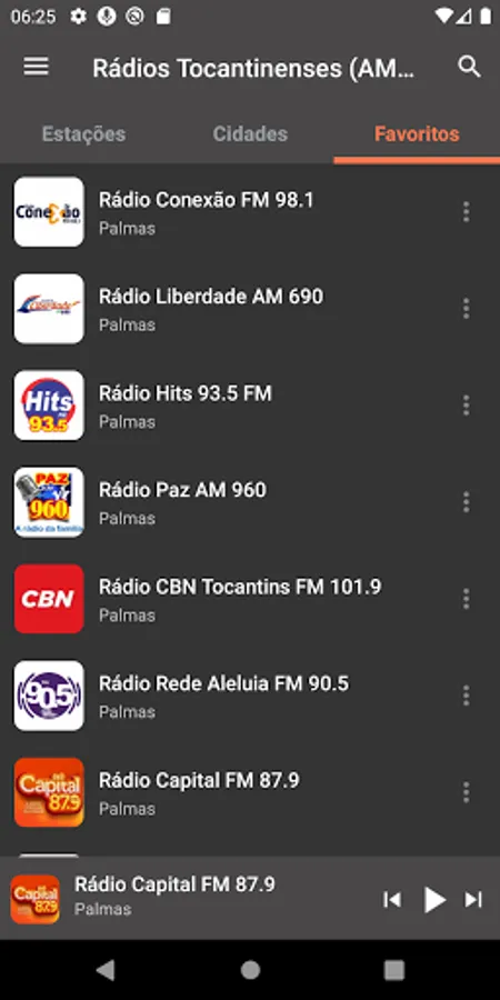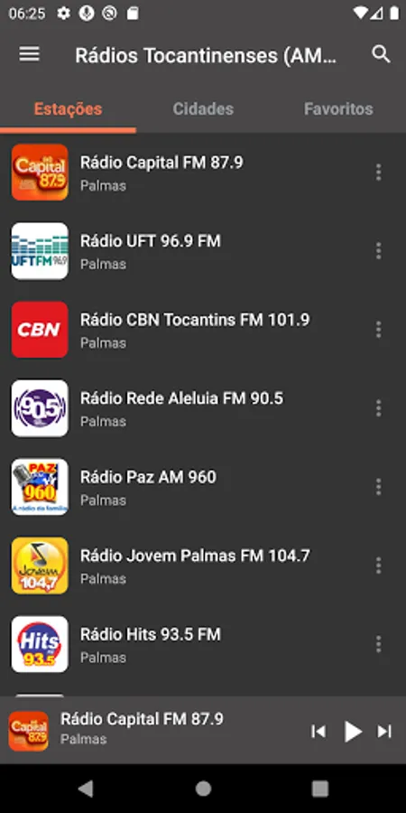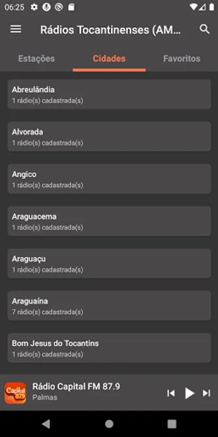 Radios from all over the state: "Palmas", "Araguatins", "Guaraí", "Tocantinópolis", "Porto Nacional", "Colinas do Tocantins", "Gurupi", "Araguaína", "Paraíso do Tocantins", "Dianópolis" and many other municipalities.