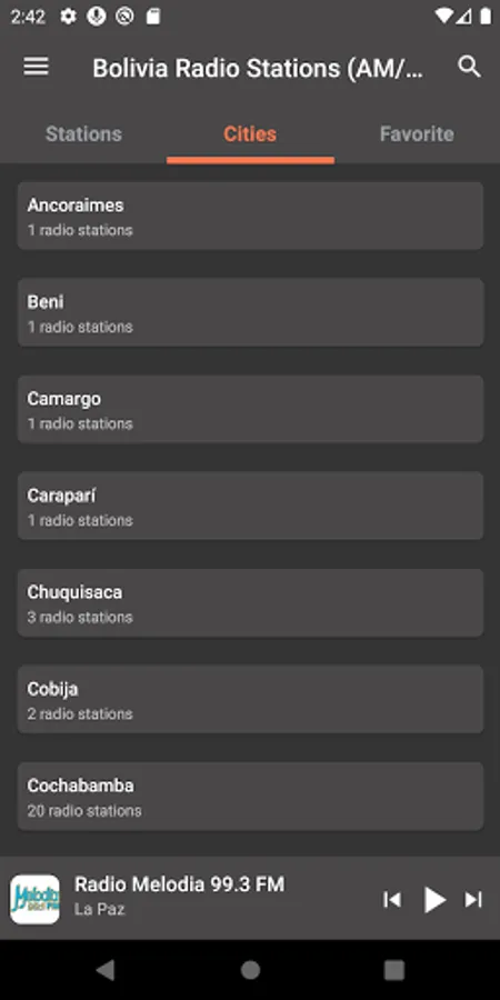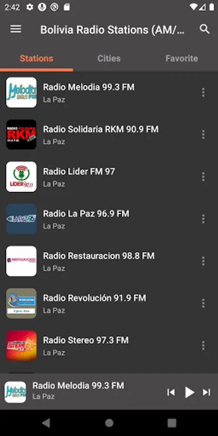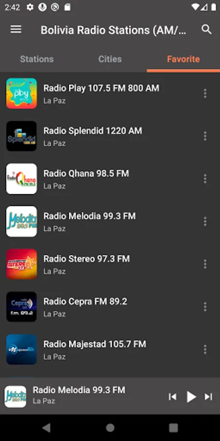 "Radio Fides La Paz 101.5 FM 760 AM", "Radio Chacaltaya 93.7 FM", "Radio Panamericana 580 AM 96.1 FM", "Radio San Gabriel 620 AM", "Radio Gigante 94.9 FM", "Radio Kawsachun Coca 99.1 FM", "Radio Play 107.5 FM 800 AM", "Radio Bolivia 94.9 FM", "Radio ATB 107.3 FM", "Radio Mi Favorita 104.1 FM", "Radio 3000 91.0 FM", "Radio Erbol 100.9 FM", "Radio Nacional de Bolivia - La Folklorisima 106.5 - 107.7 FM", "Radio Exito 93.1 FM", "Radio Mix 93.1 FM", "Radio Show 90.7 FM", "Radio Ancoraimes 95.3 FM", "Radio ATB 89.2 FM", "Radio Disney 102.5 FM", "Radio Silver Mix 95.3 FM", "Radio Panamericana 106.3 FM", "Radio Guadalupe 105.1 FM", "Radio Caliente 105.1 FM", "Radio Splendid 1220 AM", "RAI 97.9 FM" and many other radio stations.