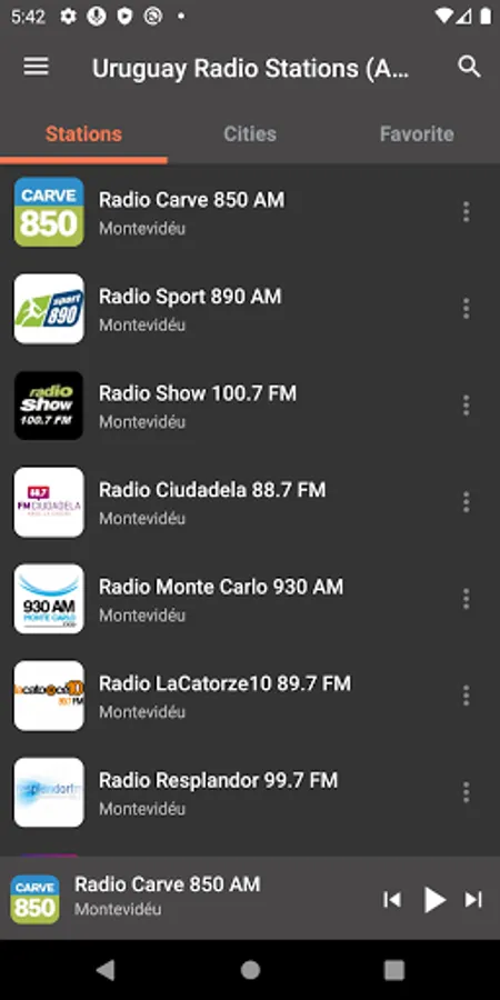 "Radio Oriental 770 AM", "Radio Carve 850 AM", "Radio Universal 970 AM", "Radio Sport 890 AM", "Radio Azul 101.9 FM", "Radio Centenario 1250 AM", "Radio Clarin 580 AM", "Radio Espectador 810 AM", "Radio Sarandi 690 AM", "Radio La Voz de Melo 1340 AM", "Radio Coronilla 102.3 FM", "Radio Libertador 92.3 FM", "Radio 1010 AM", "Radio Oldies 90.3 FM", "Radio Horizonte 89.3 FM" and many other radio stations.