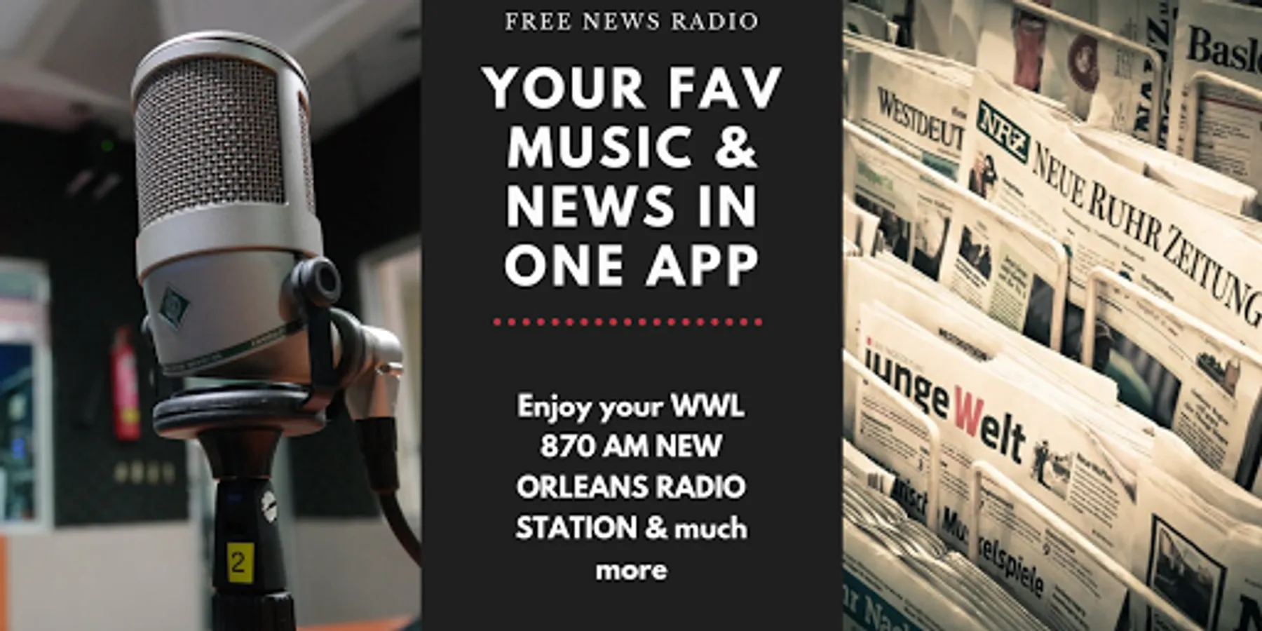 With this RADIO APP WWL 870 Am it is possible to listen to the TOP HIT Music of the month, and several kinds of music like pop, rock, hard rock, metal, heavy metal, trash metal, Nu Metal, Classic Rock, Country Music, Salsa, Merengue,Bachata, Reggueton, classical music, reggae, jazz, R&B, Rap, Trap, Sports Talks and games, news radio programs 24/7 for free!