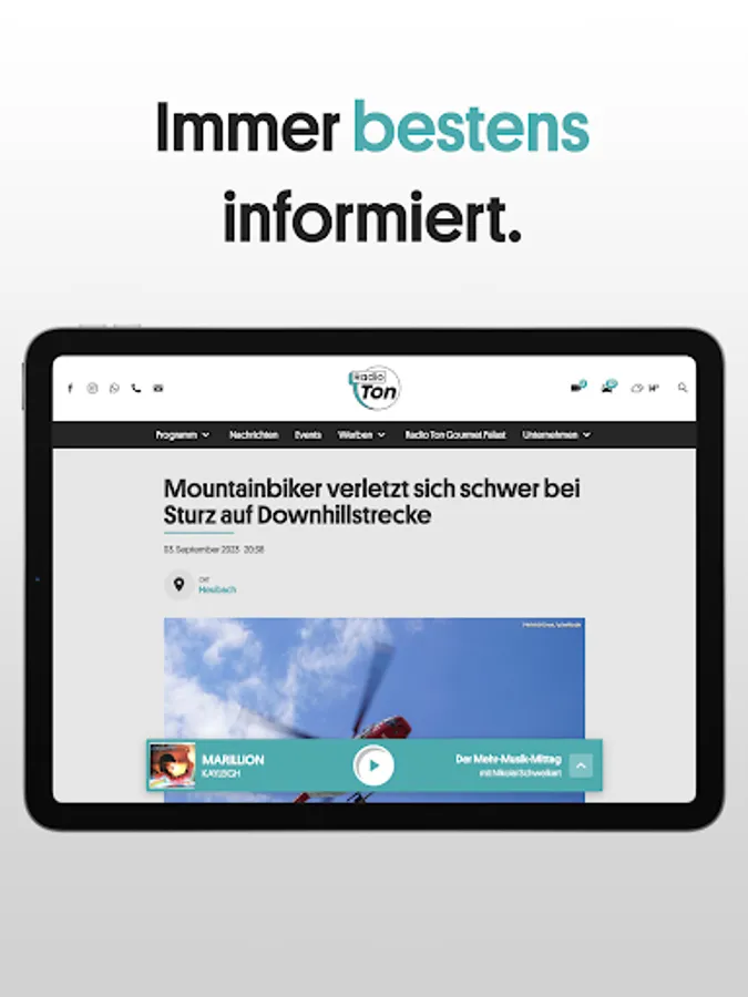With the Radio Ton app, you can receive the best music mix and the most variety, anytime, anywhere. Whether with your tablet or smartphone - worldwide in outstanding quality! And that's not all: With the app you are always up to date, know about all radio sound promotions and don't miss anything!