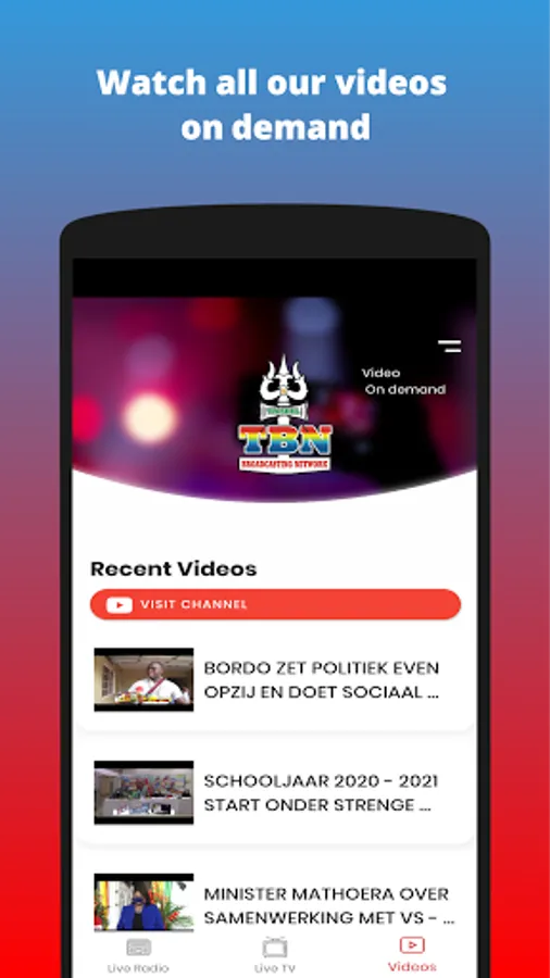 Watch and listen to all programs from Trishul Broadcasting Network (Suriname) in one app. In the TBN app you can listen to the various radio stations of Trishul Broadcasting Network anytime anywhere. Also watch channel 20.1 Trishul Television live for the latest movies, shows and local productions.