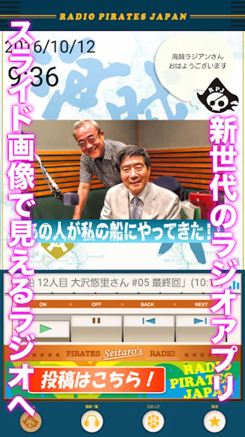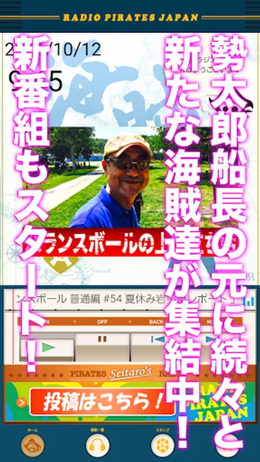 The radio station ``Setaro's Pirate Radio'', a free app, broadcasts original pirate radio programs by personalities from a variety of fields, led by radio personality Setaro Ohno.