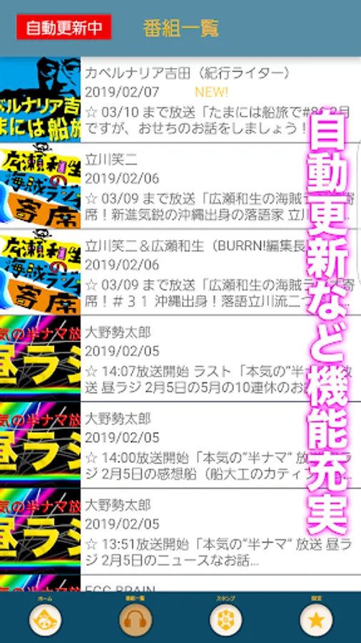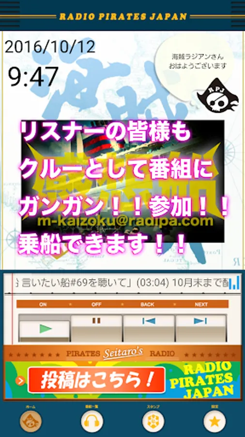 In addition, the support information program "REDS Chikara SHIP" for supporters of the Urawa Reds soccer team, "Listen to me, Mr. Takahama," "Kazuo Hirose's Pirate Radio Vaudeville," "Plum and Cherry Blossom Security Ship," and "Yurioka Chotoku Q's Shiny High Speed "Ships", "Cavernaria Yoshida's Sometimes on a Boat Trip", "Takuya Fukushima's Alternative Radio Ship", "Makabe/Nakamura's Pirate Scrum Radio", and other talk programs with various genres such as sports, politics, economics, and entertainment, as well as interviews with guests. Please pay attention!