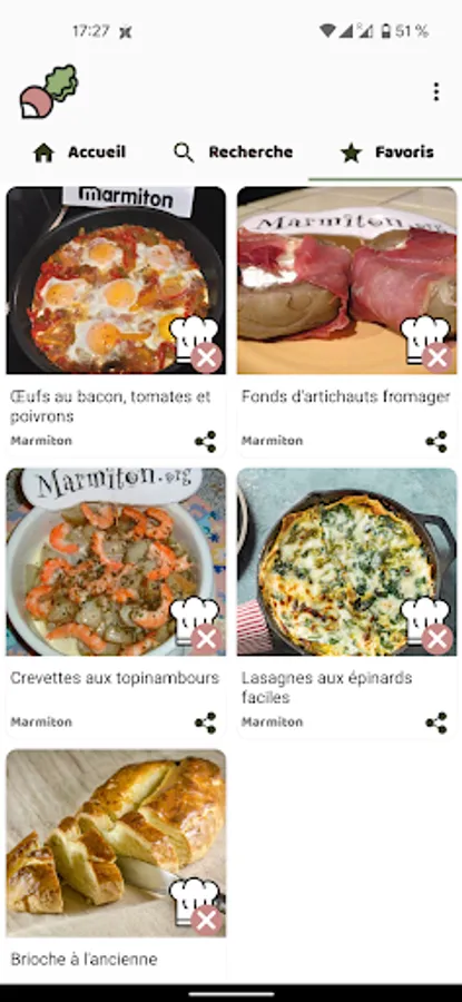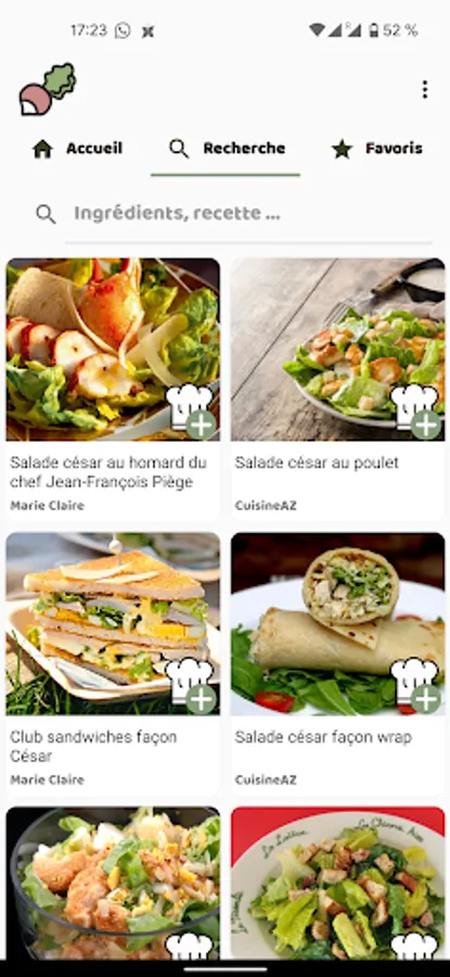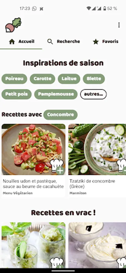 Radis offers to carry out searches based on seasonal fruits and vegetables! You can also find your favorite recipes with favourites.