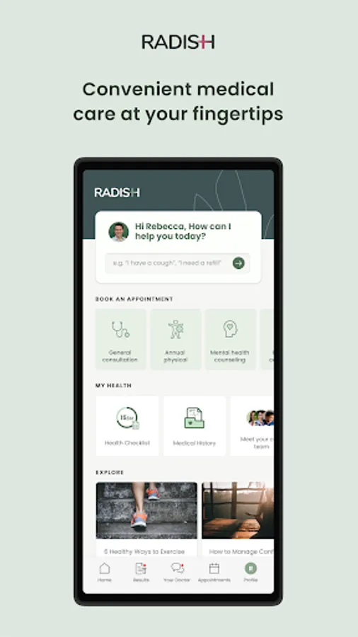 We understand that health care is difficult to navigate and we’ve been there before. We created Radish Health to empower you with tools and knowledge to achieve your best health. Diagnose illnesses, understand conditions, manage prescriptions, or receive therapy whenever you need it - our team is here to support you every step of the way.